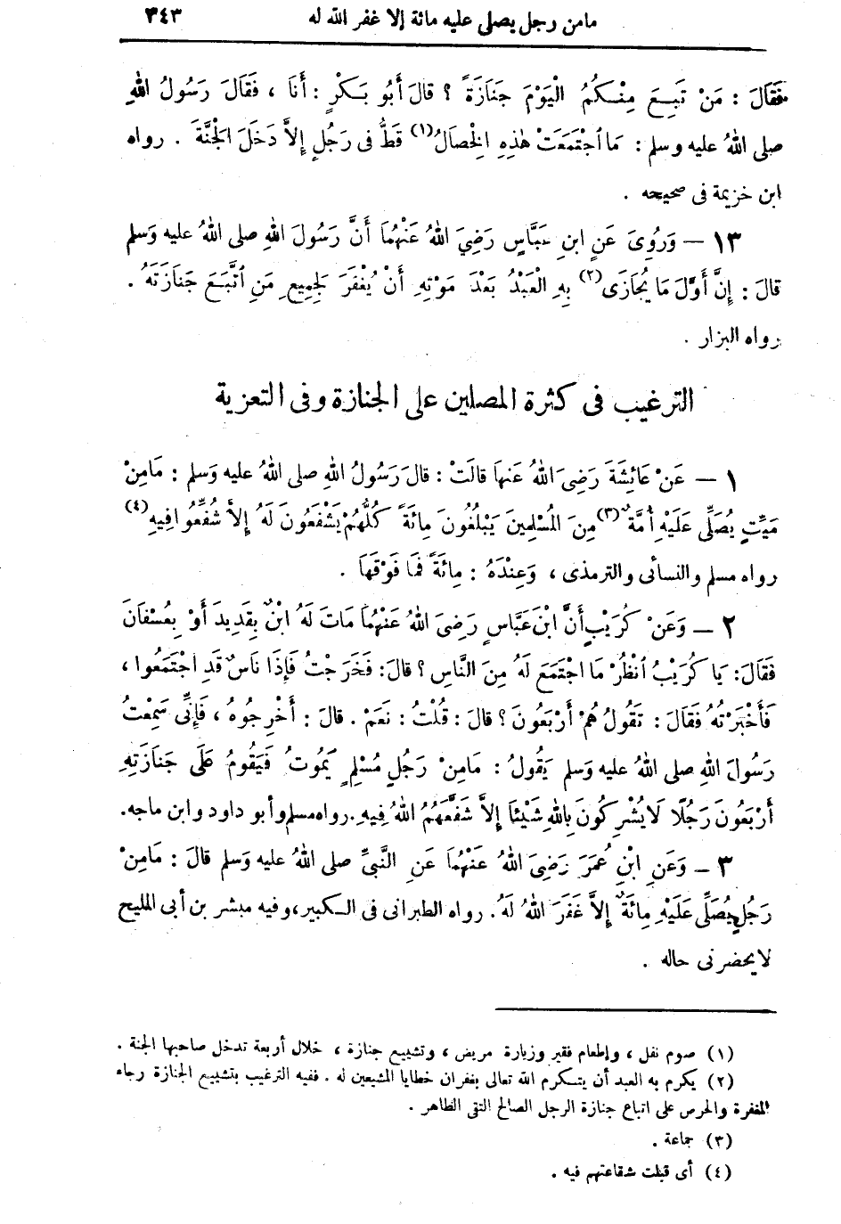 3 - وَعَنِ ابْنِ عُمَرَ رَضِيَ اللهُ عَنْهُمَا عَنِ النَّبِيِّ صلى اللهُ عليه وسلم قالَ: مَا مِنْ رَجُلٍ يُصَلِّي عَلَيْهِ مِائَةٌ إِلاَّ غَفَرَ اللهُ لَهُ. رواه الطبراني في الكبير، وفيه مبشر بن أبي المليح لا يحضرني حاله.