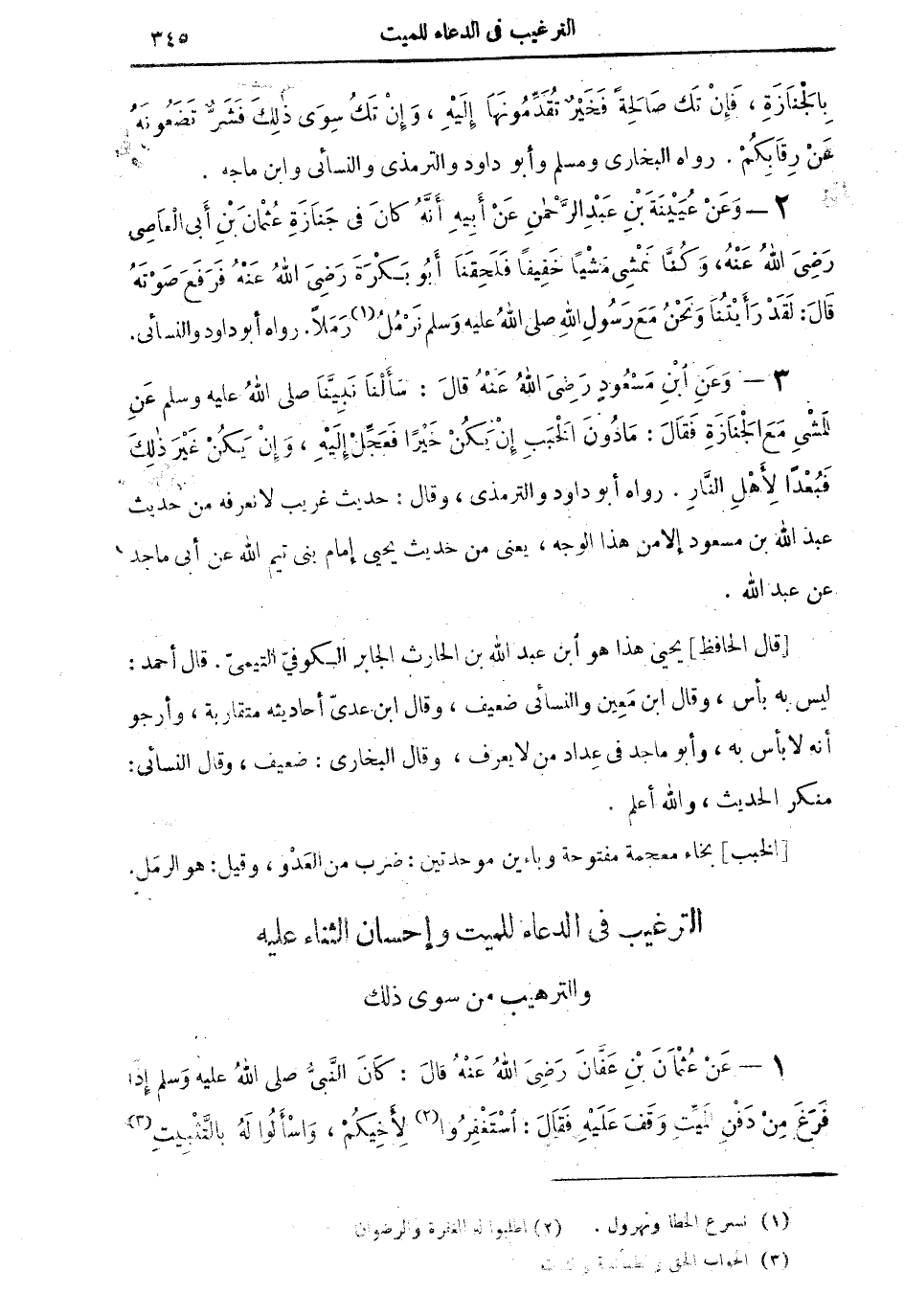 3 - وَعَنِ ابْنِ مَسْعُودٍ رَضِيَ اللهُ عَنْهُ قالَ: سَأَلْنَا نَبِيَّنَا صَلى اللهُ عليه وسلم عَنِ الْمَشْيِ مَعَ الْجَنَازَةِ فَقَالَ: مَا دُونَ الْخَبَبِ إِنْ يَكُنْ خَيْراً فَعَجِّلْ إِلَيْهِ، وَإِنْ يَكُنْ غَيْرَ ذَلِكَ فَبُعْداً لأَهْلِ النَّارِ. رواه أبو داود والترمذي، وقال: حديث غريب لا نعرفه من حديث عبد الله بن مسعود إلا من هذا الوجه، يعني من حديث يحيى إمام بني تيم الله عن أبي ماجد عن عبد الله.
