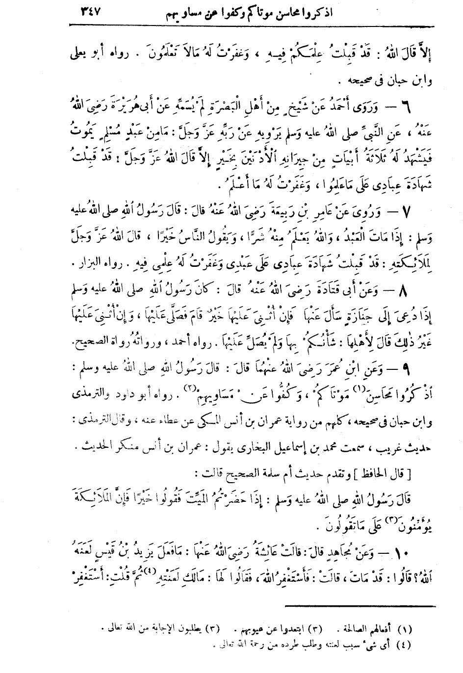 9 - وَعَنِ ابْنِ عُمَرَ رَضِيَ اللهُ عَنْهُمَا قالَ: قالَ رَسُولُ اللهِ صلى اللهُ عليه وسلم: اذْكُرُوا مَحَاسِنَ (¬1) مَوْتَاكُمْ، وَكُفُّوا عَنْ مَسَاوِيهِمْ (¬2). رواه أبو داود والترمذي. حديث غريب، سمعت محمد بن إسماعيل البخاري يقول: عمران بن أنس منكر الحديث.