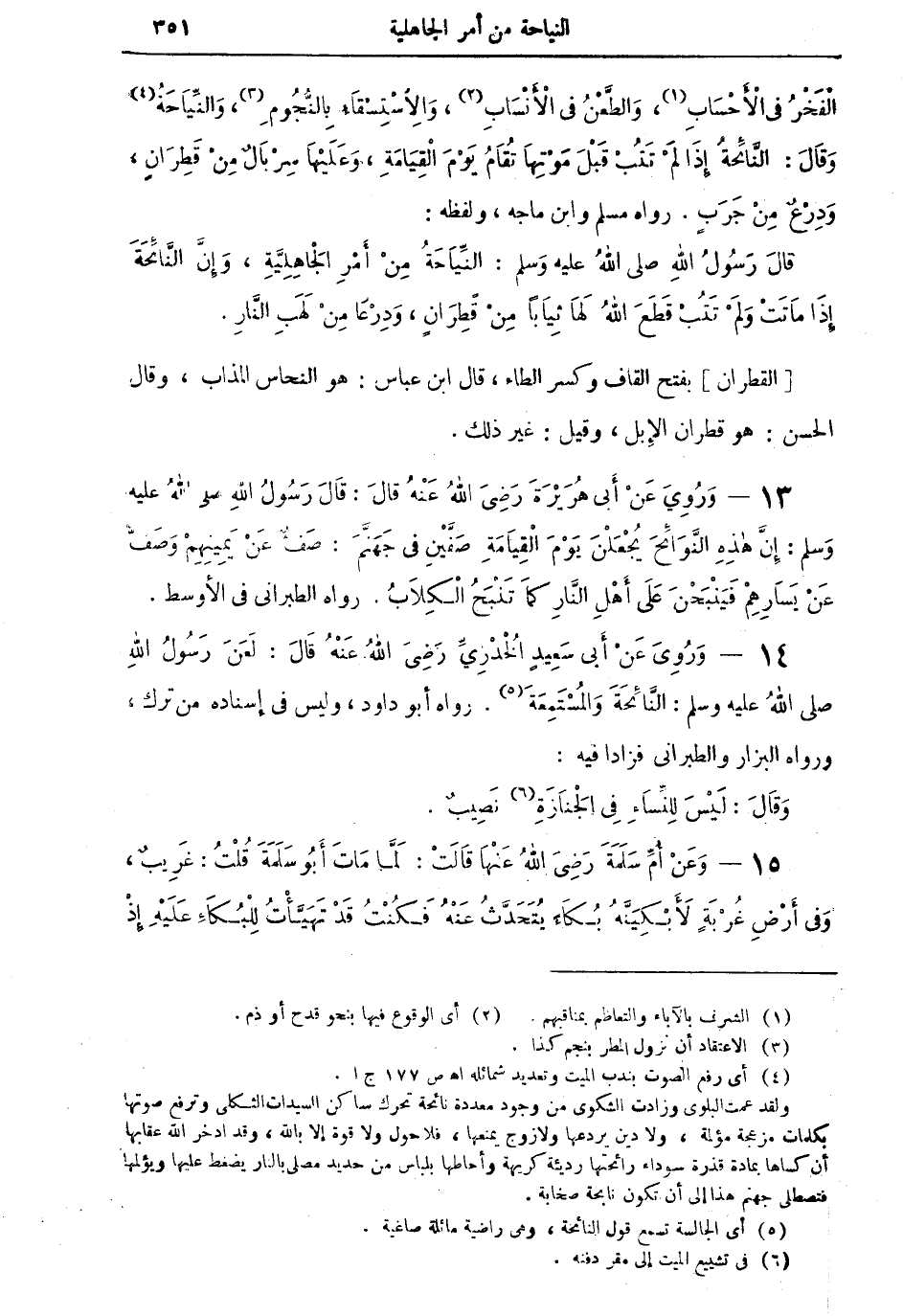 الْفَخْر في الأَحْسَابِ (¬1)، والطَّعْنُ في الأَنْسَابِ (¬2)، وَالاسْتِسْقَاءُ بِالنُّجُومِ (¬3)، والنِّيَاحَةُ (¬4) وَقَالَ: النَّائِحَةُ إِذَا لَمْ تَتُبْ قَبْلَ مَوْتِهَا تُقَامُ يَوْمَ الْقِيَامَةِ، وَعَلَيْهَا سِرْبَالٌ مِنْ قَطِرَانٍ، وَدِرْعُ مِنْ جَرَبٍ. رواه مسلم وابن ماجة، ولفظه: