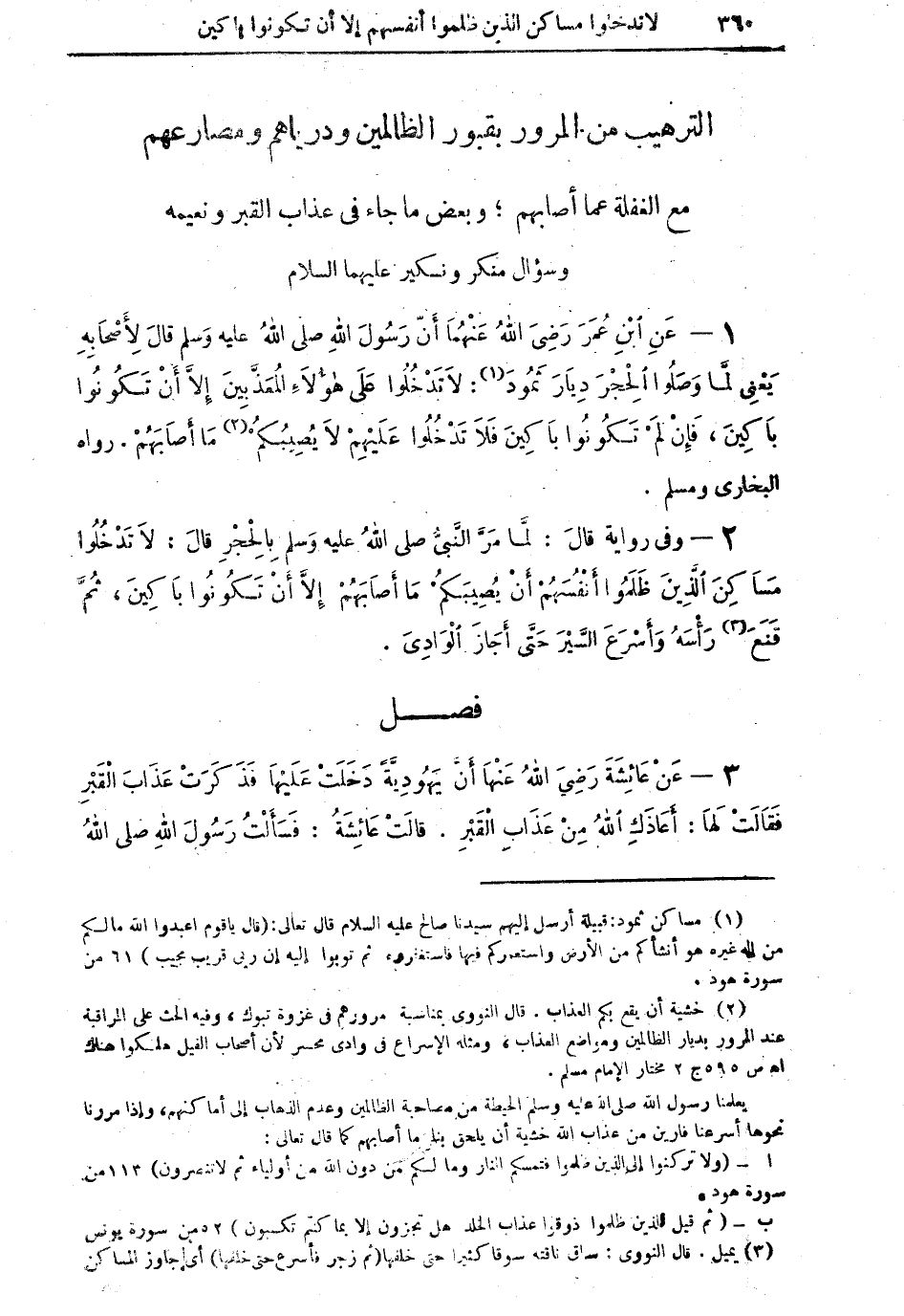 1 - عَنِ ابْنِ عُمَرَ رَضِيَ اللهُ عَنْهُمَا أَنَّ رَسُولَ اللهِ صلى اللهُ عليه وسلم قالَ لأَصْحَابِهِ: يَعْنِي لَمَّا وَصَلُوا الْحِجْرَ دِيَارَ ثَمُودَ (¬1) لاَ تَدْخُلُوا عَلَى هَؤُلاءِ الْمُعَذَّبِينَ إِلاَّ أَنْ تَكُونُوا بَاكِينَ، فَإِنْ لَمْ تَكُونُوا بَاكِينَ فَلاَ تَدْخُلُوا عَلَيْهِمْ لاَ يُصِيبُكُمْ (¬2) مَا أَصَابَهُمْ. رواه البخاري ومسلم.