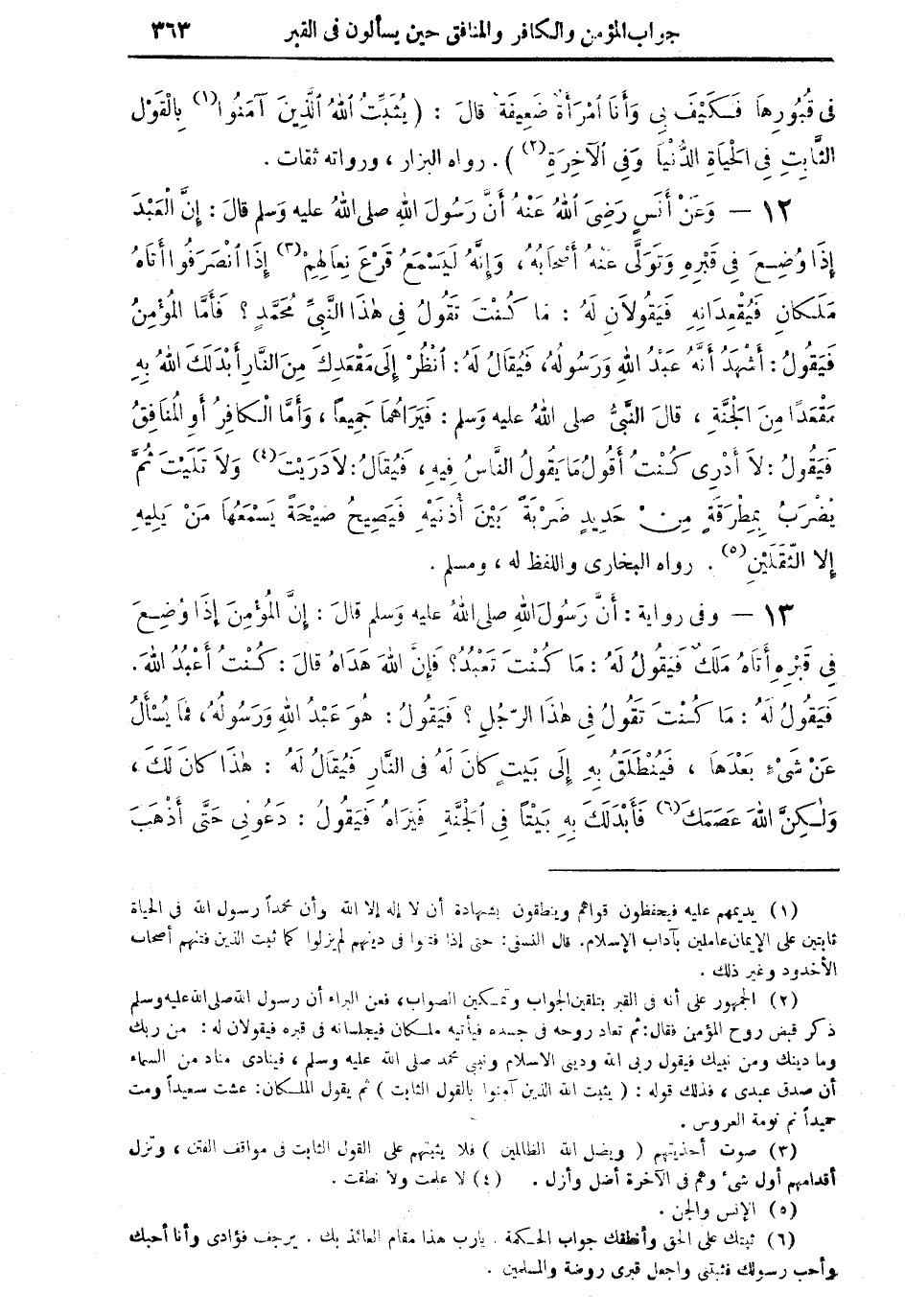 13 - وفي رواية: أَنَّ رَسُولَ اللهِ صلى اللهُ عليه وسلم قالَ: إِنَّ الْمُؤْمِنَ إِذا وُضِعَ في قَبْرِهِ أَتَاهُ مَلَكٌ فيَقُولُ لَهُ: مَا كُنْتَ تَعْبُدُ؟ فَإِنَّ اللهُ هَدَاهُ قالَ: كُنْتُ أَعْبُدُ اللهَ. فَيَقُولُ لَهُ: مَا كُنْتَ تَقُولُ في هذَا الرَّجُلِ؟ فَيَقُولُ: هُوَ عَبْدُ اللهِ وَرَسُولُهُ، فَمَا يُسْأَلُ عَن شَيْءٍ بَعْدَهَا، فَيُنْطَلَقُ بِهِ إِلى بَيْتٍ كَانَ لَهُ في النَّارِ فَيُقَالُ لَهُ: هذَا كانَ لَكَ، وَلكِنَّ اللهُ عَصَمَكَ (¬6) فَأَبْدَلَكَ بِهِ بَيْتاً في الْجَنَّةِ فَيَرَاهُ فَيَقُولُ: دَعُوني حَتَّى أَذْهَبَ فَأُبَشِّرَ