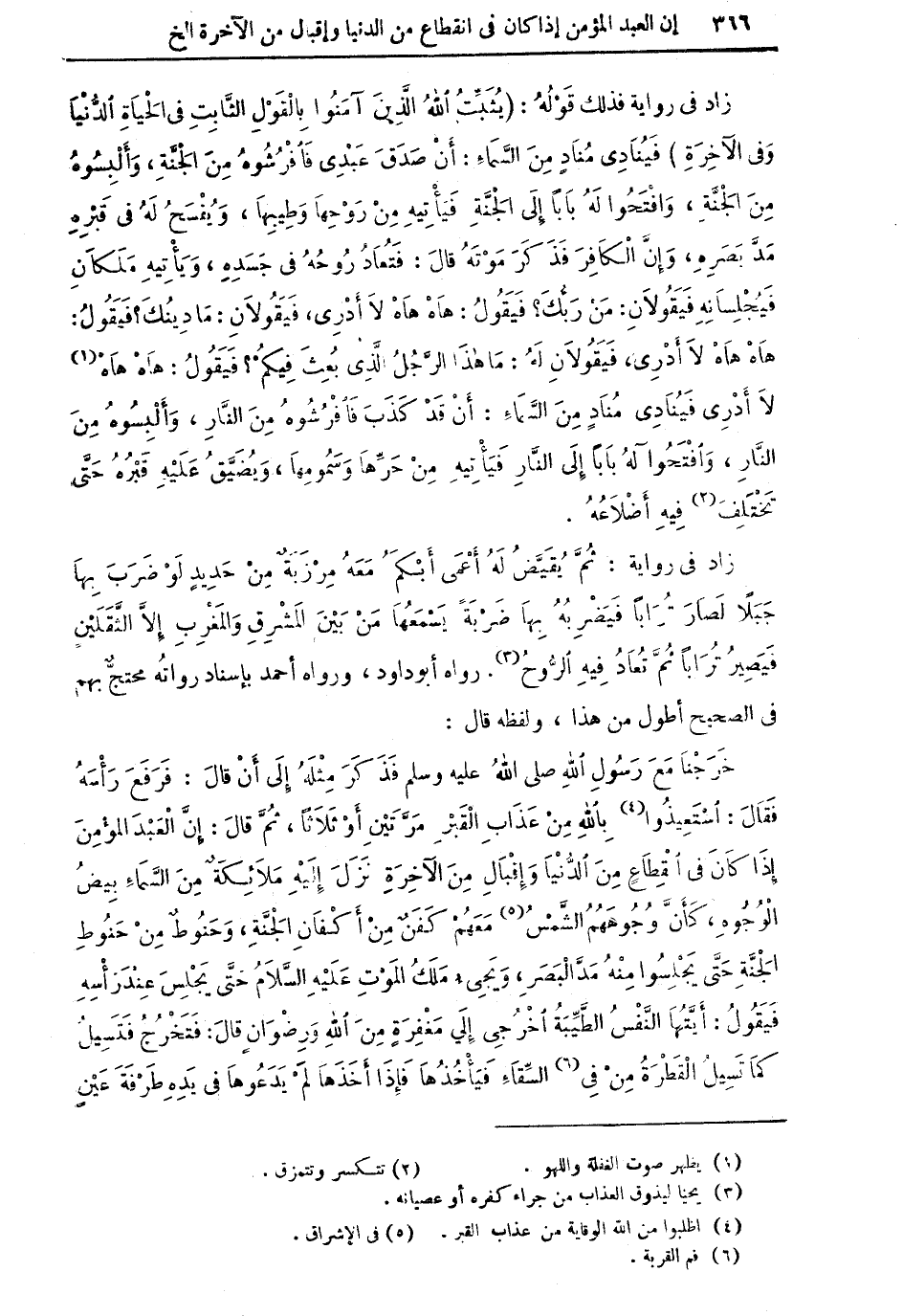 زاد في رواية فذلك قَوْلُهُ: [يُثَبِّتُ اللهُ الَّذِينَ آمَنُوا بِالْقَوْلِ الثَّابِتِ في الْحَيَاةِ الدُّنْيَا وَفي الآخِرَةِ] فَيُنَادِي مُنَادٍ مِنَ السَّمَاءِ: أَنْ صَدَقَ عَبْدِي فَافْرُشُوهُ مِنَ الْجَنَّةِ، وَأَلْبِسُوهُ مِنَ الْجَنَّةِ، وافْتَحُوا لَهُ بَاباً إِلى الْجَنَّةِ فَيَأْتِيهِ مِنْ رَوْحِهَا وَطِيبِهَا، وَيُفْسَحُ لَهُ في قَبْرِهِ مَدَّ بَصَرِهِ، وَإِنَّ الْكَافِرَ فَذَكَرَ مَوْتَهُ قالَ: فَتُعَادُ رُوحُهُ في جَسَدِهِ، وَيَأْتِيهِ مَلَكَان فَيُجْلِسَانِهِ فَيَقُولاَنِ: مَنْ رَبُّكَ؟ فَيَقُولُ: هَاهْ هَاهْ لاَ أَدْرِي: فَيَقُولانِ: مَا دِينُكَ؟ فَيَقُولُ: هَاهْ هَاهْ لاَ أَدْرِي، فَيَقُولاَنِ لَهُ: مَا هذَا الرَّجُلُ الَّذِي بُعِثَ فِيكُمْ؟ فَيَقُولُ: هَاهْ هَاهْ (¬1) لاَ أَدْرِي فَيُنَادِي مُنَادٍ مِنَ السَّمَاءِ: أَنْ قَدْ كَذَبَ فَافْرُشُوهُ مِنَ النَّارِ، وَأَلْبِسُوهُ مِنَ النَّارِ، وافْتَحُوا لَهُ بَاباً إِلى النَّارِ فَيَأْتِيهِ مِنْ حَرِّهَا وَسَمُومِهَا، ويُضَيَّقُ عَلَيْهِ قَبْرُهُ حَتَّى تَخْتَلِفَ (¬2) فِيهِ أَضْلاعُهُ.