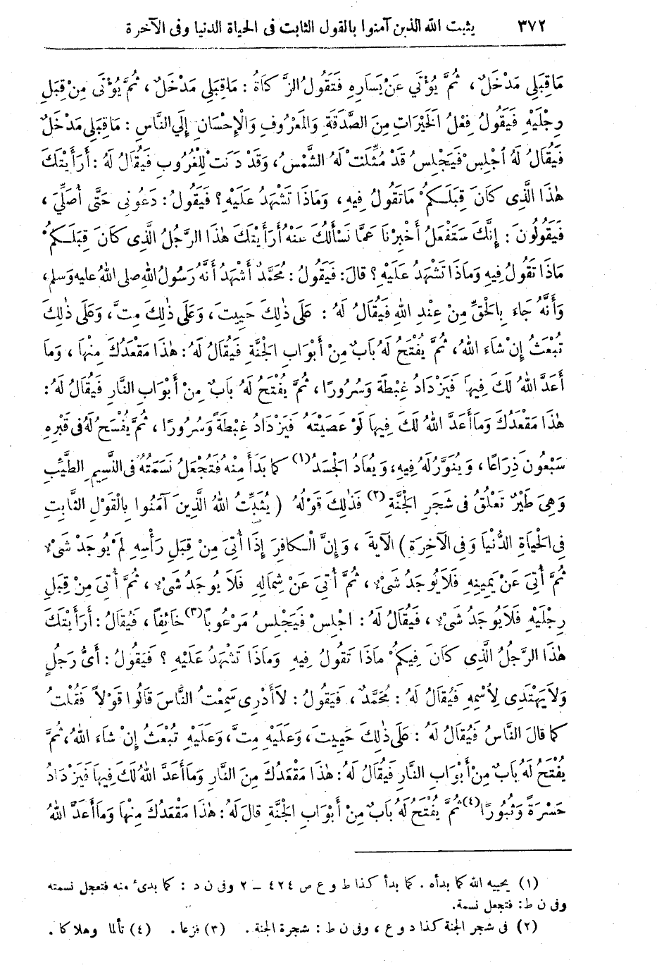مَا قِبَلي مَدْخلٌ، ثُمَّ يُؤْتَى عَنْ يَسَارِهِ فَتَقُولُ الزَّكَاةُ: مَا قِبَلِي مَدْخَلٌ، ثُمَّ يُؤْتَى مِنْ قِبَلِ رِجْلَيْهِ فَيَقُولُ فِعْلُ الْخَيْرَاتِ مِنَ الصَّدَقَةِ وَالْمَعْرُوفِ وَالإِحْسَانِ إِلى النَّاسِ: مَا قِبَلِي مَدْخَلٌ فَيُقَالُ لَهُ اجْلِسْ فَيَجْلِسُ قَدْ مُثِّلَتْ لَهُ الشَّمْسُ، وَقَدْ دَنَتْ لِلْغُرُوبِ فَيُقَالُ لَهُ: أَرَأَيْتَكَ هذَا الَّذِي كانَ قِبَلَكُمْ مَا تَقُولُ فِيهِ، وَمَاذَا تَشْهَدُ عَلَيْهِ فَيَقُولُ: دَعُونِي حَتَّى أُصَلِّيَ، فَيَقُولُونَ إِنَّكَ سَتَفْعَلُ أَخْبِرْنَا عَمَّا نَسْأَلُكَ عَنْهُ أَرَأَيْتَكَ هذَا الرَّجُلُ الَّذِي كَانَ قِبَلَكُمْ مَاذَا تَقُولُ فِيهِ، وَمَاذَا تَشْهَدُ عَلَيْهِ؟ قالَ: فَيَقُولُ: مَحَمَّدٌ أَشْهَدُ أَنَّهُ رَسُولُ اللهِ صلى اللهُ عليه وسلم، وَأَنَّهُ جَاءَ بالْحَقِّ مِنْ عِنْدِ اللهِ فَيُقَالُ لَهُ: عَلَى ذَلِكَ حَيِيتَ، وَعَلى ذَلِكَ مِتَّ، وَعَلَى ذَلِكَ تُبْعَثُ إِنْ شَاءَ اللهُ، ثُمَّ يُفْتَحُ لَهُ بَابٌ مِنْ أَبْوَابِ الْجَنَّةِ فَيُقَالُ لَهُ: هذَا مَقْعَدُكَ مِنْهَا، وَمَا أَعَدَّ اللهُ لَكَ فِيهَا فَيَزْدَادُ غِبْطَةً وَسُرُوراً، ثُمَّ يُفْتَحُ لَهُ بَابٌ مِنْ أَبْوَابِ النَّارِ فَيُقَالُ لَهُ: هذَا مَقْعَدُكَ وَمَا أَعَدَّ اللهُ لَكَ فِيهَا لَوْ عَصَيْتَهُ فَيَزْدَادُ غِبْطَةً وَسُرُوراً، ثُمَّ يُفْسَحُ لَهُ فِي قَبْرِهِ سَبْعُونَ ذِرَاعاً وَيُنَوَّرُ لَهُ فِيهِ، وَيُعَادُ الْجَسَدُ (¬1) كَما بَدَأَ مِنْهُ فَتُجْعَلُ نَسَمَتُهُ في النَّسِيمِ الطَّيِّبِ وَهِيَ طَيْرٌ تَعْلَقُ في شَجَرِ الْجَنَّةِ (¬2)