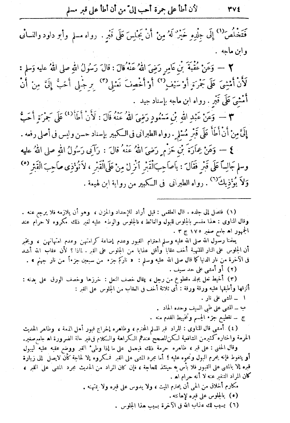 (¬4) أمشي قال المناوي: المراد قبر المسلم المحترم، وظاهره إخراج قبور أهل الذمة، وظاهر الحديث الحرمة واختاره كثير من الشافعية لكن المصحح عندهم الكراهة والكلام في غير حالة الضرورة أهـ جامع صغير.