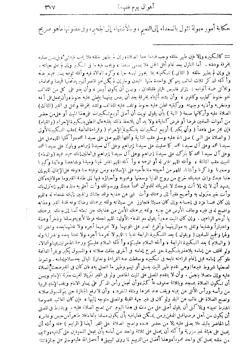 = كالكبير وإلا فإن ظهر خلقه وجب فيه ما عدا الصلاة، وإن لم يظهر خلقه فلا يجب فيه شيء، بل يسن ستره بخرقة ودفنه. أما النازل بعد تمام أقل الحمل فلا يسمى سقطاً، ويجب فيه ما في الكبير وإن لم تعلم حياته. بل وإن لم يظهر خلقه (الثاني) تكفينه بما يجوز لبسه حياً، وكره المغالاة فيه وأقله ثوب يستر جميع بدنه وأكمله للذكر ثلاث لفائف يعم كل واحدة منها البدن وجاز وإن لم يكن نحو قاصر أن يزيد تحتها قميصاً وعمامة، وللأثنى خمسة أثواب: إزار فقميص فخمار فلفافتان. ويسن أن يكون أبيض، وأن يذر على كل من اللفائف نحو حنوط كطيب وكافور، وأن يشد أليتاه بخرقة بعد أن يدس بينهما بقطن عليه حنوط، وأن يجعل على أنفه ومنخريه وأذنيه وجبهته وركبتيه قطن عليه حنوط وتلف عليه اللفائف وتشد بخرقة وتحل في القبر (الثالث) الصلاة عليه وأركانها سبعة (النية) بأن يقول نويت أن أصلي أربع تكبيرات على هذا الميت أو على من حضر من أموات المسلمين فرضاً أو فرض كفاية، ولا بد أن يلاحظ ذلك بقلبه حال النطق بتكبيرة الإحرام (والقيام) فإن عجز صلى قاعداً (وأن يكبر) أربع تكبيرات بتكبيرة الإحرام (وقراءة الفاتحة) عقب التكبيرة الأولى (والصلاة على النبي) صلى الله عليه وسلم عقب الثانية وأقلها اللهم صل على سيدنا محمد، وأكملها اللهم صل على سيدنا محمد وعلى آل سيدنا محمد كما صليت على سيدنا إبراهيم وعلى آل سيدنا إبراهيم وبارك على سيدنا محمد وعلى آل سيدنا محمد كما باركت على سيدنا إبراهيم وعلى آل سيدنا إبراهيم في العالمين إنك حميد مجيد (والدعاء) للميت عقب الثالثة، وأقله اللهم اغفر له أو ارحمه، وأكمله اللهم اغفر لحينا وميتنا وشاهدنا وغائبنا وكبيرنا وصغيرنا وذكرنا وأنثانا اللهم من أحييته منا فأحيه على الإسلام، ومن توفيته منا فتوفه على الإيمان اللهم إن هذا عبدك وابن عبديك خرج من روح الدنيا وسعتها ومحبوبه وأحباؤه فيها إلى ظلمة القبر وما هو لاقيه، كان يشهد أن لا إله إلا أنت وحدك لا شريك لك وأن محمداً عبدك ورسولك وأنت أعلم به منا، اللهم إنه نزل بك وأنت خير منزول به وأصبح فقيراً إلى رحمتك وأنت غني عن عذابه وقد جئناك راغبين إليك شفعاء له، اللهم إن كان محسناً فزد في إحسانه وإن كان مسيئاً فتجاوز عن سيئاته ولقه برحمتك رضاك وقه فتنة القبر وعذابه وافسح له في قبره وجاف الأرض عن جنبه ولقه برحمتك الأمن من عذابك حتى تبعثه آمناً إلى جنتك برحمتك يا أرحم الراحمين. وإن كان الميت صغيراً يقول مع الدعاء الأول: اللهم اجعله فرطاً لأبويه وسفاً وذخراً وعظة واعتباراً وشفيعاً وثقل به موازينهما، وأفرغ الصبر على قلوبهما ولا تحرمهما أجره ولا وتفتنهما بعده واغفر لنا ولهما ولجميع المسلمين (ويقول) بعد التكبيرة الرابعة ندباً: اللهم لا تحرمنا أجره ولا تفتنا بعده واغفر لنا وله (والسلام) بعد التكبيرة الرابعة، وأقله السلام عليكم، وأكمله السلام عليكم ورحمة الله مرتين يميناً وشمالاً. ولو تخلف عن إمامه بلا عذر بتكبيرة حتى شرع إمامه في أخرى بطلت صلاته، والمسبوق يكبر ويقرأ الفاتحة فلو كبر إمامه قبل إتمام قراءته تابعه في تكبيره وسقطت عنه القراءة وتدارك الباقي بعد سلام إمامه. وشرط لصحتها شروط غيرها: وهي تقدم طهر الميت بغسل أو تيمم وطهر ما اتصل به، فإن كان في القبر صحت الصلاة عليه وإن متصلاً بنجس. وأن لا يتقدم المصلي على الميت الحاضر ولو في القبر تنزيلاً للميت منزلة الإمام ويسن أن تكون الصلاة بمسجد وبثلاثة صفوف فأكثر، وأن تجعل رأس الذكر على يسار الإمام ويقف الإمام قريباً من رأسه ورأس الأنثى عن يمينه ويقف عند عجزها ومثله المنفرد، وأن لا ترفع الجنازة حتى يتم المسبوق صلاته وتصح الصلاة على غائب عن البلد ولو كان في غير جهة القبلة والمصلي متوجه إليها، فإن كان الغائب مخصوصاً اشترط تعيينه وإلا كفى أن يقول أصلي على من مات في هذا اليوم ممن تصح الصلاة عليه. ويشترط في المصلي أن يكون من أهل فرضها قبل الدفن بزمن يمكن فعلها فيه بأن يكون مسلماً بالغاً عاقلاً طاهراً من حيض ونفاس، أما الحاضر بالبلد فلا يصلي عليه إل
