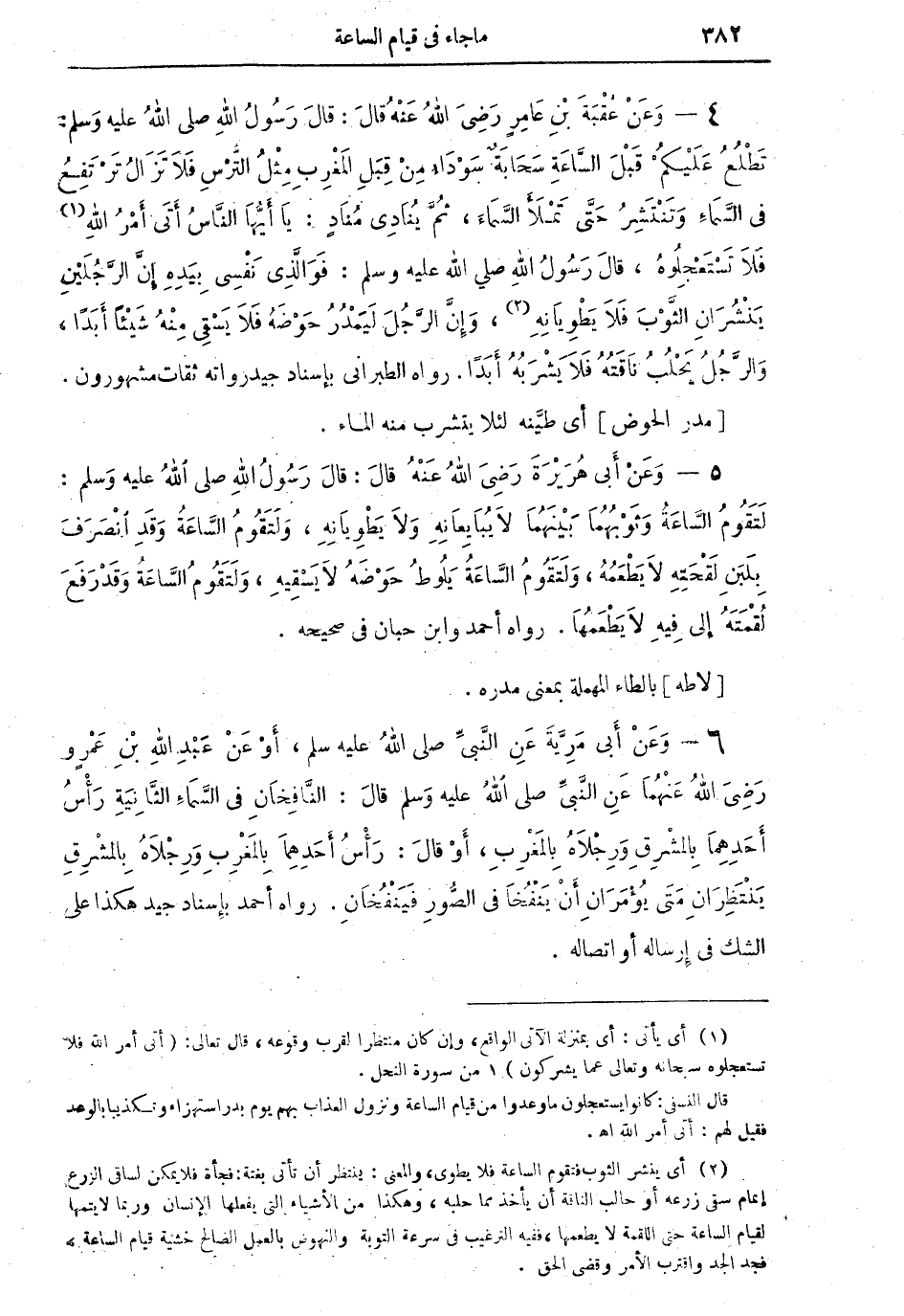 5 - وَعَنْ أَبِي هُرَيْرَةَ رَضِيَ اللهُ عَنْهُ قالَ: قالَ رَسُولُ اللهِ صلى اللهُ عليه وسلم: لَتَقُومُ السَّاعَةُ وَثَوْبُهُمَا بَيْنَهُمَا لاَ يُبَايِعَانِهِ وَلاَ يَطْوِيَانِهِ، وَلَتَقُومُ السَّاعَةُ وَقَدِ انْصَرَفَ بِلَبَنِ لَفْحَتِهِ لاَ يَطْعَمُهُ، وَلَتَقُومُ السَّاعَةُ يَلُوطُ حَوْضَهُ لاَ يَسْقِيهِ، وَلَتَقُومُ السَّاعَةُ وَقَدْ رَفَعَ لُقْمَتَهُ إِلى فِيهِ لاَ يَطْعَمُهَا. رواه أحمد وابن حبان في صحيحه.