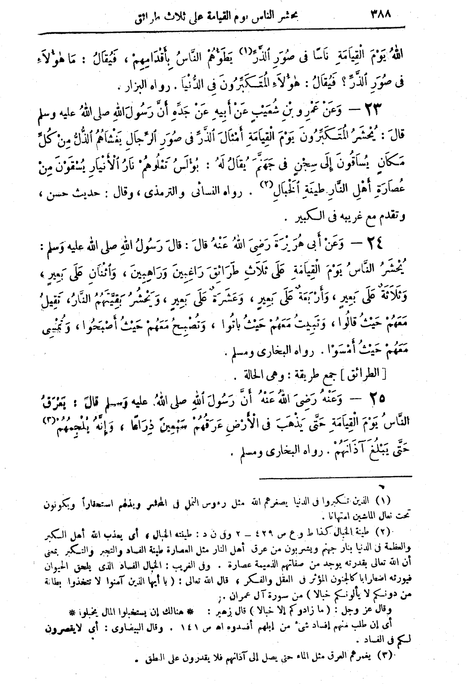 (¬1) الذين تكبروا في الدنيا يصغرهم الله مثل رؤوس النمل في المحشر، ويذلهم استحقاراً ويكونون تحت نعال الماشين امتهاناً.