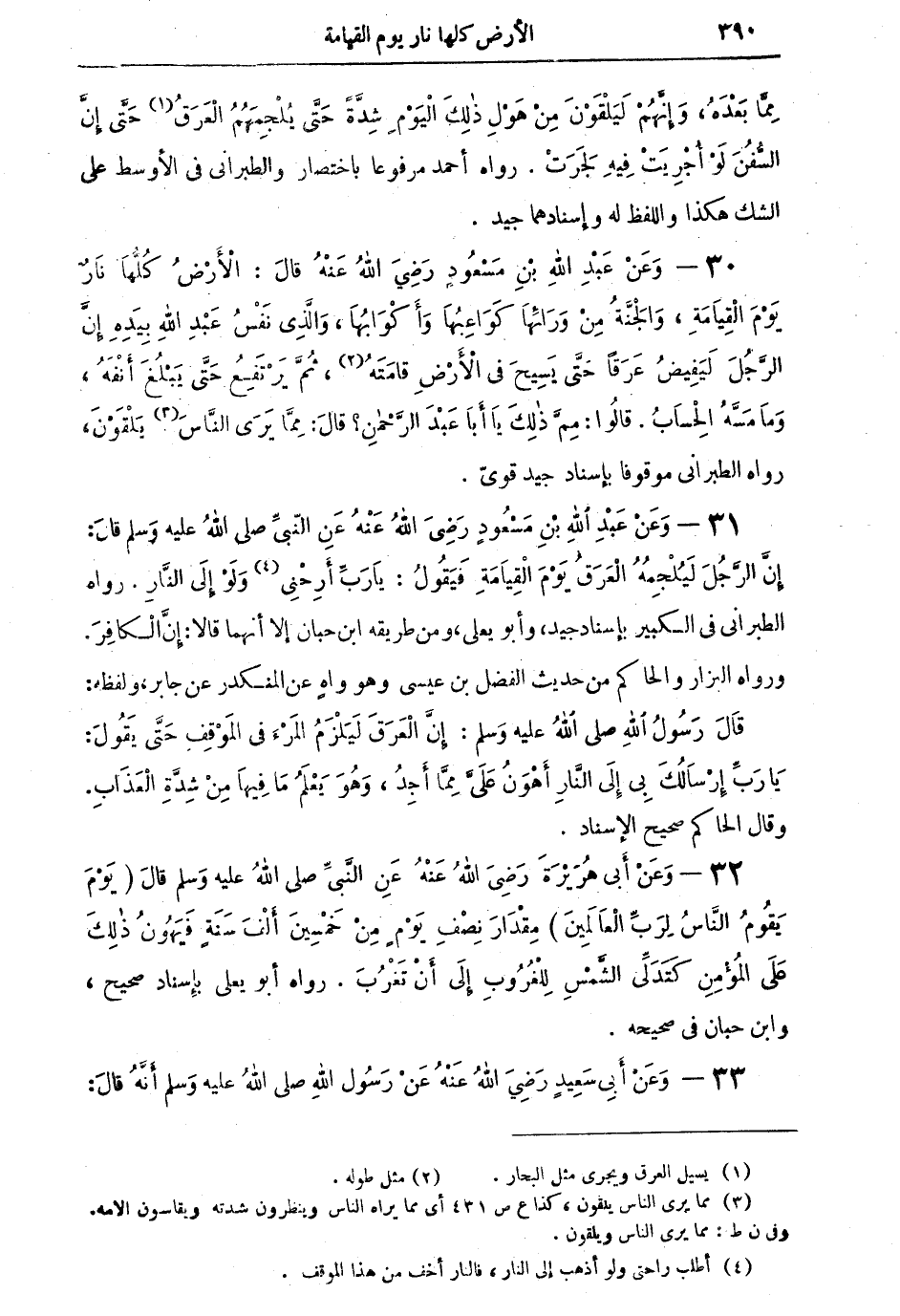 31 - وَعَنْ عَبْد اللهِ بْنِ مَسْعُودٍ رَضِيَ اللهُ عَنْهُ عَنِ النَّبِيِّ صلى اللهُ عليه وسلم قالَ: إِنَّ الرَّجُلَ لَيُلْجِمُهُ الْعَرَقُ يَوْمَ الْقِيَامَةِ فَيَقُولُ: يَا رَبِّ أَرِحْنِي (¬4) وَلَوْ إِلى النَّارِ. رواه الطبراني في الكبير بإِسناد جيد، وأبو يعلى، ومن طريقه ابن حبان إلا أنهما قالا: إِنَّ الْكَافِرَ. ورواه البزار والحاكم من حديث الفضل بن عيسى وهو واهٍ عن المنكدر عن جابر، ولفظه: