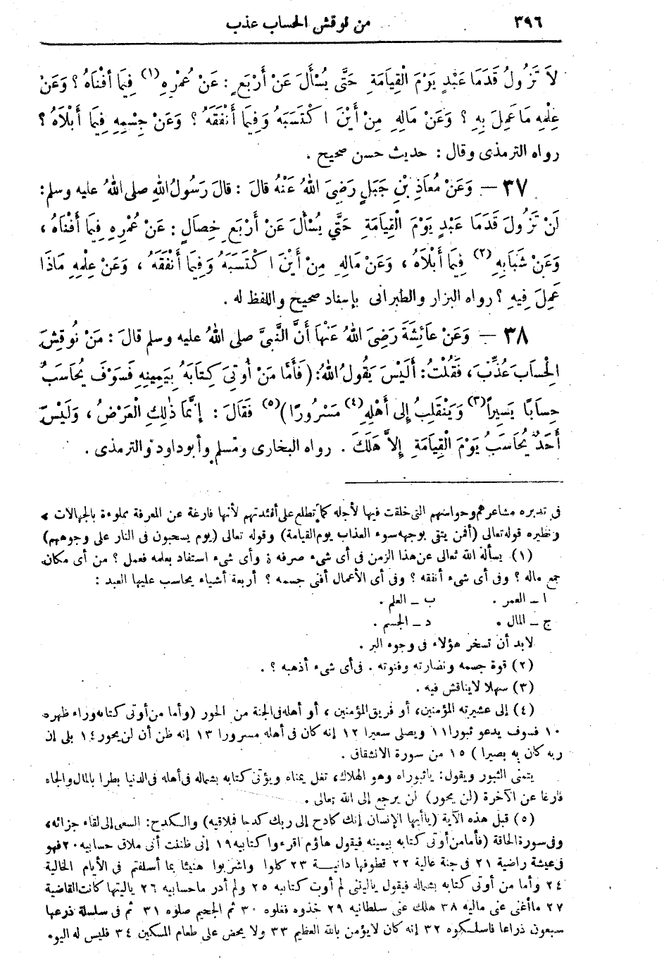38 - وَعَنْ عَائِشَةَ رَضِيَ اللهُ عَنْهَا أَنَّ النَّبِيَّ صلى اللهُ عليه وسلم قالَ: مَنْ نُوقِشَ الْحِسَابَ عُذِّبَ، فَقُلْتُ: أَلَيْسَ يَقُولُ اللهُ: [فَأَمَّا مَنْ أُوتِيَ كِتَابَهُ بِيَمِينِهِ فَسَوْفَ يُحَاسَبُ حِسَاباً يَسِيراً (¬3) وَيَنْقَلِبُ إِلى أَهْلِهِ (¬4) مَسْرُوراً] (¬5)