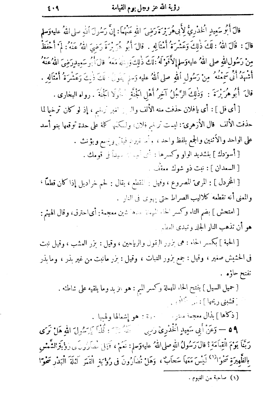 59 - وَعَنْ سَعِيدٍ الْخُدْرِيِّ رَضِيَ اللهُ عَنْهُ قالَ: قُلْنَا: يَا رَسُولَ اللهِ هَلْ نَرَى رَبَّنَا يَوْمَ الْقِيَامَةِ؟ قالَ رَسُولُ اللهِ صلى اللهُ عليه وسلم: نَعَمْ، فَهَلْ تُضَارُونَ في رُؤْيَةِ الشَّمْسِ بِالظَّهِيرَةِ صَحْواً (¬1) لَيْسَ مَعَهَا سَحَابٌ، وَهَلْ تُضَارُونَ في رُؤْيَةِ الْقَمَرِ لَيْلَةَ الْبَدْر
