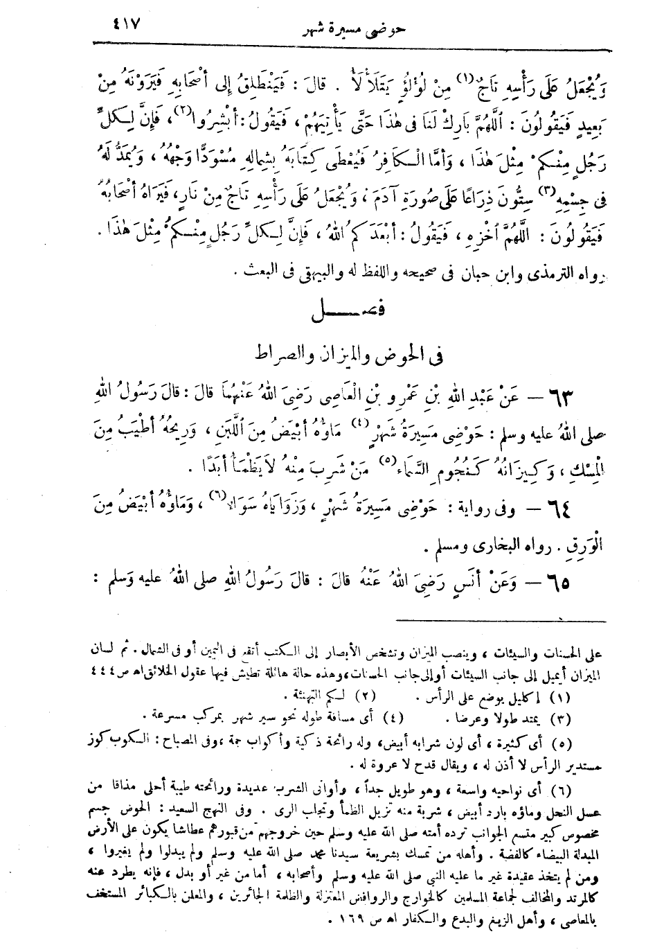 (¬6) أي نواحيه واسعة، وهو طويل جداً، وأواني الشرب عديدة ورائحته طيبة أحلى مذاقاً من عسل النحل وماؤه بارد أبيض، شربة منه تزيل الظمأ وتجلب الري. وفي النهج السعيد: الحوض جسم مخصوص كبير متسع الجوانب ترده أمته صلى الله عليه وسلم حين خروجهم من قبورهم عطاشا يكون على الأرض المبدلة البيضاء كالفضة. وأهله من تمسك بشريعة سيدنا محمد صلى الله عليه وسلم ولم يبدلوا ولم يغيروا، ومن لم يتخذ عقيدة غير ما عليه النبي صلى الله عليه وسلم حين خروجهم من قبورهم عطاشاً يكون على الأرض المبدلة البيضاء كالفضة. وأهله من تمسك بشريعة سيدنا محمد صلى الله عليه وسلم ولم يبدلوا ولم يغيروا، ومن لم يتخذ عقيدة غير ما عليه النبي صلى الله عليه وسلم وأصحابه، أما من غير أو بدل، فإنه يطرد عنه كالمرتد والمخالف لجماعة المسلمين كالخوارج والروافض المعتزلة والظلمة الجائرين، والمعلن بالكبائر المستخف بالمعاصي، وأهل الزيغ والبدع والكفار أهـ ص 169.