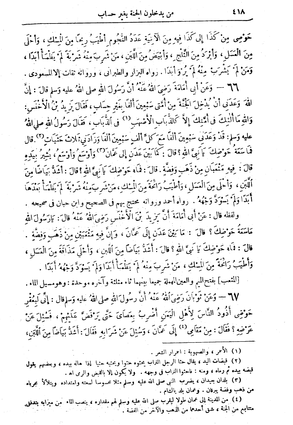 (¬4) من المدينة إلى عمان طولاً ليقرب صلى الله عليه وسلم لهم مقداره، ينصب الماء من ميزابه بتدفق متتابع من الجنة، شق أحدهما من الذهب والآخر من الفضة.