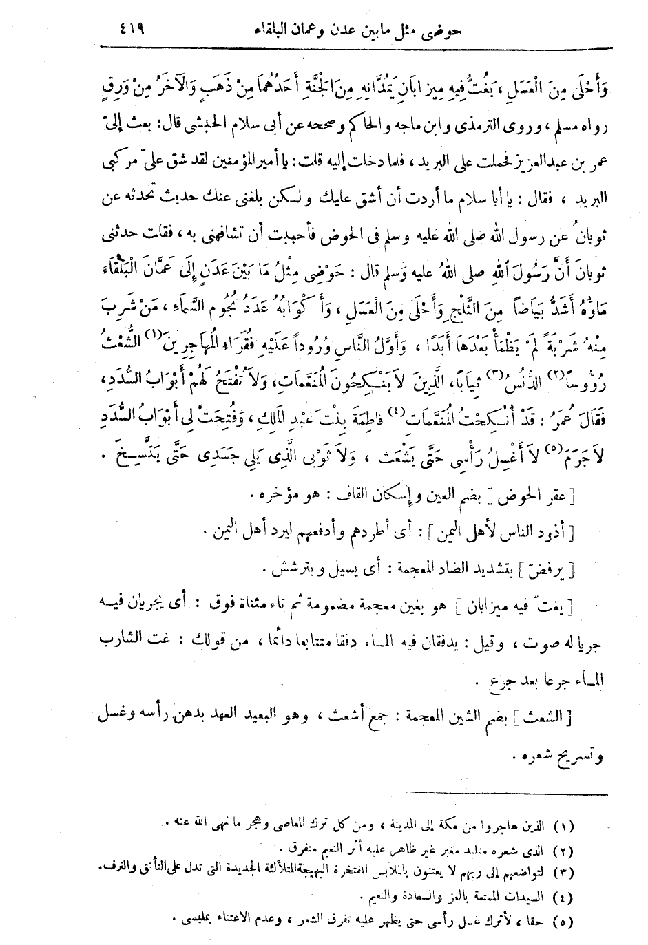 وَأَحْلَى مِنَ الْعَسَلِ، يَغُتُّ فِيهِ مِيزَابَانِ يَمُدَّانِهِ مِنَ الْجَنَّةِ أَحَدُهُمَا مِنْ ذَهَبٍ وَالآخَرُ مِنْ وَرَقٍ رواه مسلم، وروى الترمذي وابن ماجة والحاكم وصححه عن أبي سلام الحبشي قال: بعث إليّ عمر بن عبد العزيز فحملت عن البريد، فلما دخلت إليه قلت يا أمير المؤمنين: لقد شق على مركبي البريد، فقال: يا أبا سلام ما أردت أن أشق عليك ولكن بلغني عنك حديث تحدثه عن ثوبان عن رَسُولِ اللهِ صلى اللهُ عليه وسلم في الحوض فأحببت أن تشافهني به، فقلت: حدثني ثوبان أن رسُولَ اللهِ صلى اللهُ عليه وسلم قال: حَوْضِي مِثْلُ مَا بَيْنَ عَدَنٍ إِلى عَمَّانَ الْبَلْقَاءِ مَاؤُهُ أَشَدُّ بَيَاضاً مِنَ الثَّلْجِ وَأَحْلَى مِنَ الْعَسَلِ، وَأَكْوَابُهُ عَدَدُ نُجُومِ السَّمَاءِ، مَنْ شَرِبَ مِنْهُ شَرْبَةً لَمْ يَظْمَأْ بَعْدَهَا أَبَداً، وَأَوَّلُ النَّاسِ وُرُوداً علَيْهِ فُقَرَاءُ الْمُهَاجِرِينَ (¬1) الشُّعْثُ رُؤْوساً (¬2) الدُّنُسُ (¬3) ثِياباً، الَّذِينَ لاَ يَنْكِحُونَ الْمنَعَّمَاتِ، وَلاَ تُفْتَحُ لَهُمْ أَبْوَابُ السُّدَدِ، فَقَالَ عُمَرُ: قَدْ أَنْكَحْتُ الْمُنَعَّمَاتِ (¬4) فاطِمَةَ بِنْتَ عَبْدِ الْمَلِكِ، وَفُتِحَتْ لِي أَبْوَأبُ السُّدَدِ لاَ جَرَمَ (¬5) لاَ أَغْسِلُ رَأْسِي حَتَّى يَشْعَثَ، وَلاَ ثَوْبِي الَّذِي يَلِي جَسَدِي حَتَّى يَتَّسِخَ.