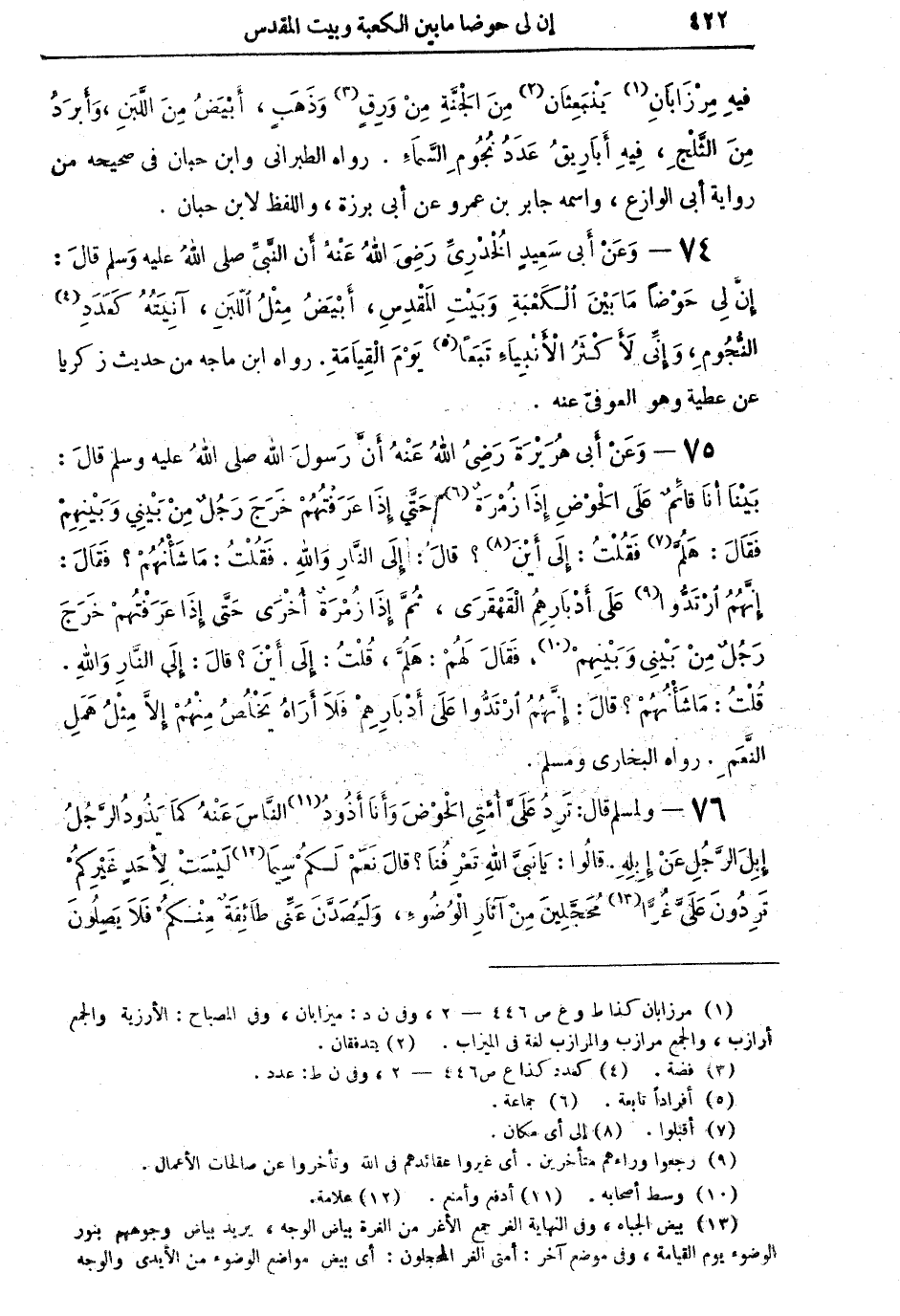 74 - وَعَنْ أَبي سَعِيدٍ الْخُدْرِيِّ رَضِيَ اللهُ عَنْهُ أَنَّ النَّبِيَّ صلى اللهُ عليه وسلم قالَ: إِنَّ لِي حَوْضاً مَا بَيْنَ الْكَعْبَةِ وَبَيْتِ الْمَقْدِسِ، أَبْيَضُ مِثْلُ اللَّبَنِ، آنِيَتُهُ كَعَدَدِ (¬4) النُّجُومِ، وَإِنِّي لأَكْثَرُ الأَنْبِيَاءِ تَبَعاً (¬5) يَوْمَ الْقِيَامَةِ. رواه ابن ماجة من حديث زكريا عن عطية وهو العوفيّ عنه.
