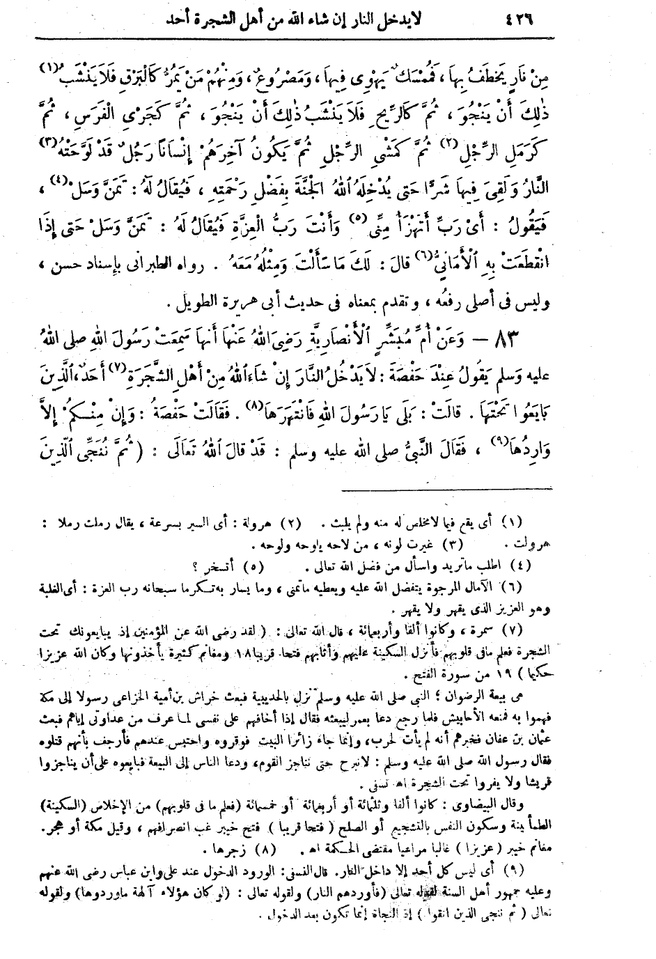 83 - وَعَنْ أُمِّ مُبَشِّرٍ الأَنْصَارِيَّةِ رَضِيَ اللهُ عَنْهَا أَنَّهَا سَمِعَتْ رَسُولَ اللهِ صلى اللهُ عليه وسلم يَقُولُ عِنْدَ حَفْصَةَ: لاَ يَدْخُلُ النَّارَ إِنْ شَاءَ اللهُ مِنْ أَهْلِ الشَّجَرَةِ (¬7)
