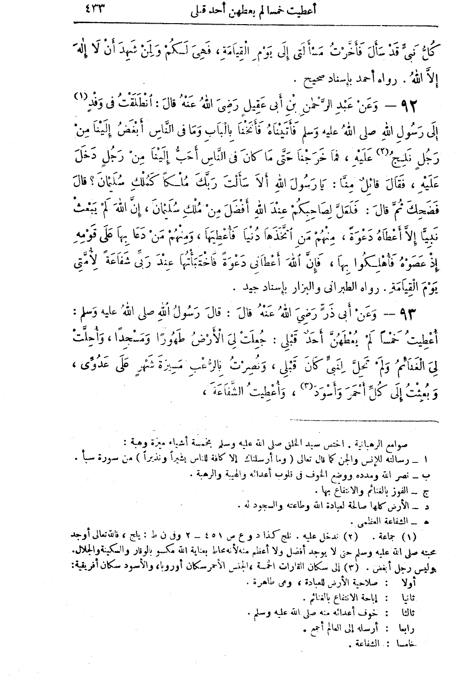 93 - وَعَنْ أَبِي ذَرٍّ رَضِيَ اللهُ عَنْهُ قالَ: قالَ رَسُولُ اللهِ صلى اللهُ عليه وسلم: أُعْطِيتُ خَمْسَاً لَمْ يُعْطَهُنّض أَحَدٌ قَبْلِي: جُعِلَتْ لِيَ الأَرْضُ طَهُوراً وَمَسْجِداً، وَأُحِلَّتْ لِيَ الْغَنَائِمُ وَلَمْ تَحِلَّ لِنَبِيٍّ كَانَ قَبْلِي، وَنُصِرْتُ بِالرُّعْبِ مَسِيرَةَ شَهْرٍ عَلَى عَدُوِّي، وَبُعِثْتُ إِلى كُلِّ أَحْمَرَ وَأَسْوَدَ (¬3)، وَأُعْطِيتُ الشَّفَاعَةَ،