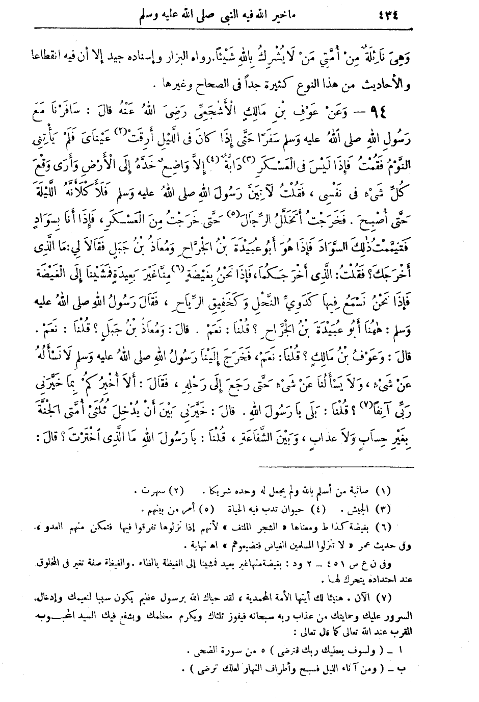94 - وَعَنْ عَوْفِ بْنِ مَالِكٍ الأَشْجَعِيِّ رَضِيَ اللهُ عَنْهُ قالَ: سَافَرْنَا مَعَ رَسُولِ اللهِ صلى اللهُ عليه وسلم سَفَراً حَتَّى إِذَا كَانَ في اللَّيْلِ أَرِقَتْ (¬2) عَيْنَايَ فَلَمْ يَأْتِنِي النَّوْمُ فَقُمْتُ فَإِذَا لَيْسَ في الْعَسْكَرِ (¬3) دَابَّةٌ (¬4) إِلاَّ وَاضِعٌ خَدَّهُ إِلى الأَرْضِ وَأُرَى وَقْعَ كُلِّ شَيءٍ في نَفْسِي، فَقُلْتُ لآتِيَنَّ رَسُولَ اللهِ صلى اللهُ عليهِ وَسَلم فلأَكْلأَنَّهُ اللَّيْلَةَ حَتَّى أُصْبِحَ. فَخَرَجْتُ أَتَخَلَّلُ الرِّجَالَ (¬5) حَتَّى خَرَجْتُ مِنَ الْعَسْكَرِ، فَإِذَا بِسَوَادٍ فَتَيَمَّمْتُ ذلِكَ السَّوَادَ فَإِذَا هُوَ أَبُو عُبَيْدَةَ بْنُ الْجَرَّاحِ وَمُعَاذُ بْنَ جَبَلٍ فَقَالاَ لِي: مَا الَّذِي أَخْرَجَكَ؟ فَقُلْتُ: الَّذِي أَخْرَجَكُمَا، فَإِذَا نَحْنُ بِغَيْضَةٍ (¬6)