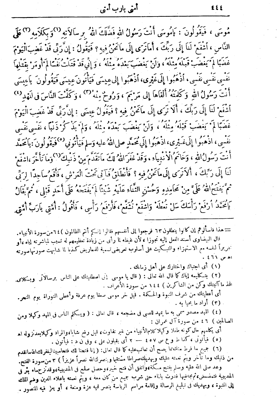 مُوسَى، فَيَقُولُونَ: يَا مُوسَى أَنْتَ رَسولُ اللهِ فَضَّلَكَ اللهُ بِرِسَالاَتِهِ (¬1) وَبِكلامِهِ (¬2) عَلَى النَّاسِ، اشْفَعْ لَنَا إِلى رَبِّكَ، أَمَا تَرَى إِلى مَا نَحْنُ فِيهِ؟ فَيَقُولُ: إِنَّ رَبِّي قَدْ غَضِبَ الْيَوْمَ غَضَباً لَمْ يَغْضَبْ قَبْلَهُ مِثْلَهُ، وَلَنْ يَغْضَبَ بَعْدَهُ مِثْلَهُ، وَإِنِّي قَدْ قَتَلْتُ نَفْسَاً لَمْ اُومَرْ بِقَتْلِهَا نَفْسِي نَفْسِي نَفْسِي، اذْهَبُوا إِلى غَيْرِي، اذْهَبُوا إِلى عِيسَى فَيَأْتُونَ عِيسَى فَيَقُولُونَ: يَا عِيسَى أَنْتَ رَسُولُ اللهِ وَكَلِمَتُهُ أَلْقَاهَا إِلى مَرْيَمَ، وَرُوحٌ مِنْهُ (¬3)، وَكَلَّمْتَ النَّاسَ في الْمَهْدِ (¬4)
