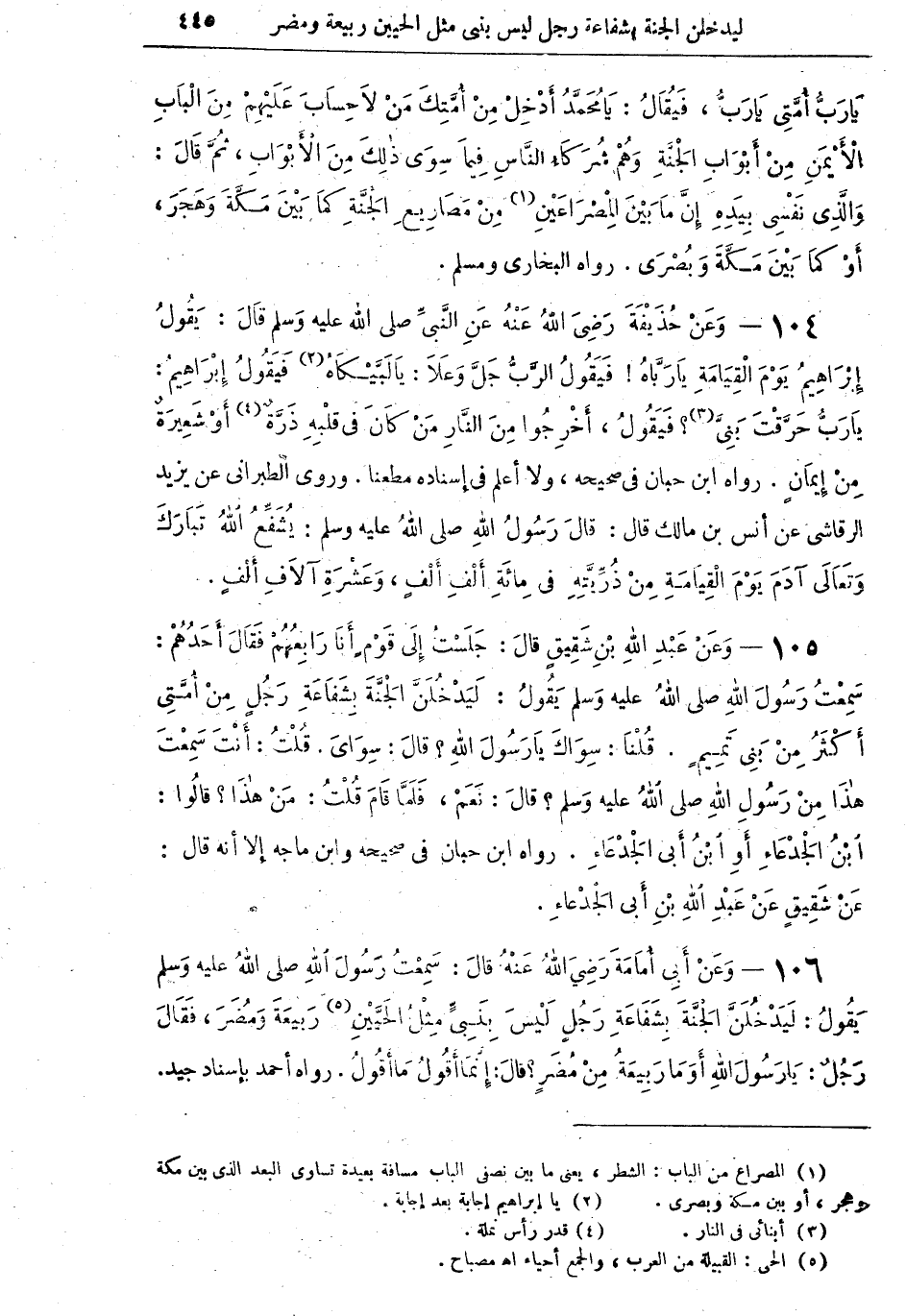 106 - وَعَنْ أَبِي أُمَامَةَ رَضِيَ اللهُ عَنْهُ قالَ: سَمِعْتُ رَسُولَ اللهِ صلى اللهُ عليه وسلم يَقُولُ: لَيَدْخُلَنَّ الْجَنَّةَ بِشَفَاعَةِ رَجُلٍ لَيْسَ بِنَبِيٍّ مِثلُ الْحَيَّيْنِ (¬5) رَبِيعَةَ وَمُضَرَ، فَقَالَ رَجُلٌ: يَا رَسُولَ اللهِ أَوَمَا رَبِيعَةُ مِنْ مُضَرٍ؟ قالَ: إِنَّمَا أَقُولُ مَا أَقُولُ. رواه أحمد بإسناد جيد.