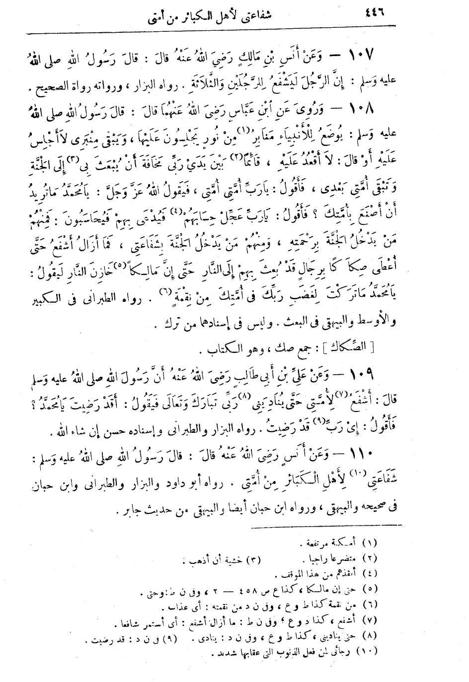 110 - وَعَنْ أَنَسٍ رَضِيَ اللهُ عَنْهُ قالَ: قالَ رَسُولُ اللهِ صلى اللهُ عليه وسلم: شَفَاعَتِي (¬10) لأَهْلِ الْكَبَائِرِ مِنْ أُمَّتِي. رواه أبو داود والبزار والطبراني وابن حبان في صحيحه والبيهقي، ورواه ابن حبان أيضاً والبيهقي من حديث جابر.