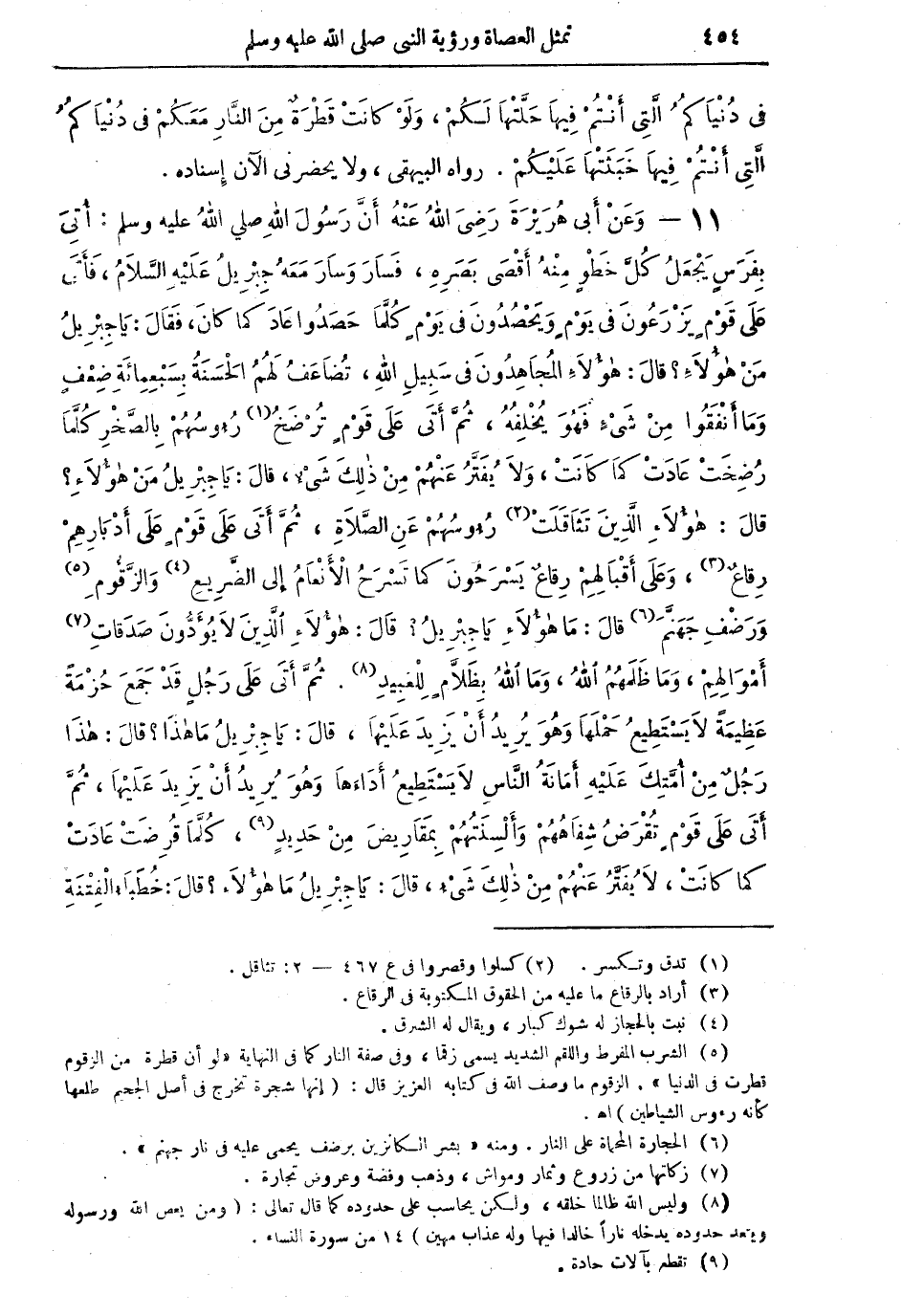 11 - وَعَنْ أَبِي هُرَيْرَةَ رَضِيَ اللهُ عَنْهُ أَنَّ رَسُولَ اللهِ صلى اللهُ عليه وسلم: أُتِيَ بِفَرَسٍ يَجْعَلُ كُلَّ خَطْوٍ مِنْهُ أَقْصَى بَصَرِهِ، فَسَارَ وَسَارَ مَعَهُ جِبْرِيلُ عَلَيْهِ السَّلامُ، فَأَتَى عَلَى قَوْمٍ يَزْرَعُونَ في يَوْمٍ وَيَحْصُدُونَ في يَوْمٍ كُلَّمَا حَصَدُوا عَادَ كَمَا كَانَ، فَقَالَ: يَا جِبْرِيلُ مَنْ هَؤُلاءِ؟ قالَ: هَؤُلاءِ الْمُجَاهِدُونَ في سَبِيلِ اللهِ، تُضَاعَفُ لَهُمُ الْحَسَنَةُ بِسَبْعِمِائَةِ ضَعْفٍ وَمَا أَنْفَقُوا مِنْ شَيءٍ فَهُوَ يُخْلِفُهُ، ثُمَّ أَتَى عَلَى قَوْمٍ تُرْضَخُ (¬1) رُؤُوسُهُمْ بِالصَّخْرِ كُلَّمَا رُضِخَتْ عَادَتْ كما كَانَتْ، وَلا يُفَتَّرُ عَنْهُمْ مِنْ ذَلِكَ شَيْءٌ، قالَ: يَا جِبْرِيلُ مَنْ هَؤلاءِ؟ قالَ: هؤلاءِ الَّذِينَ تَثَاقَلَتْ (¬2) رُؤُوسُهُمْ عَنِ الصَّلاَةِ، ثُمَّ أَتَى عَلَى قَوْمٍ عَلَى أَدْبَارِهِمْ رِقاعٌ (¬3)، وَعَلَى أَقْبَالِهِمْ رِقاعٌ يَسْرَحُونَ كما تَسْرَحُ الأَنْعَامُ إِلى الضَّرِيعِ (¬4) وَالزَّقوم (¬5) وَرَضْفِ جَهَنَّمَ (¬6) قالَ: مَا هَؤلاءِ يَا جِبْرِيلُ؟ قالَ: هَؤلاءِ الَّذِينَ لاَ يُؤَدُّونَ صَدَقَاتِ (¬7)
