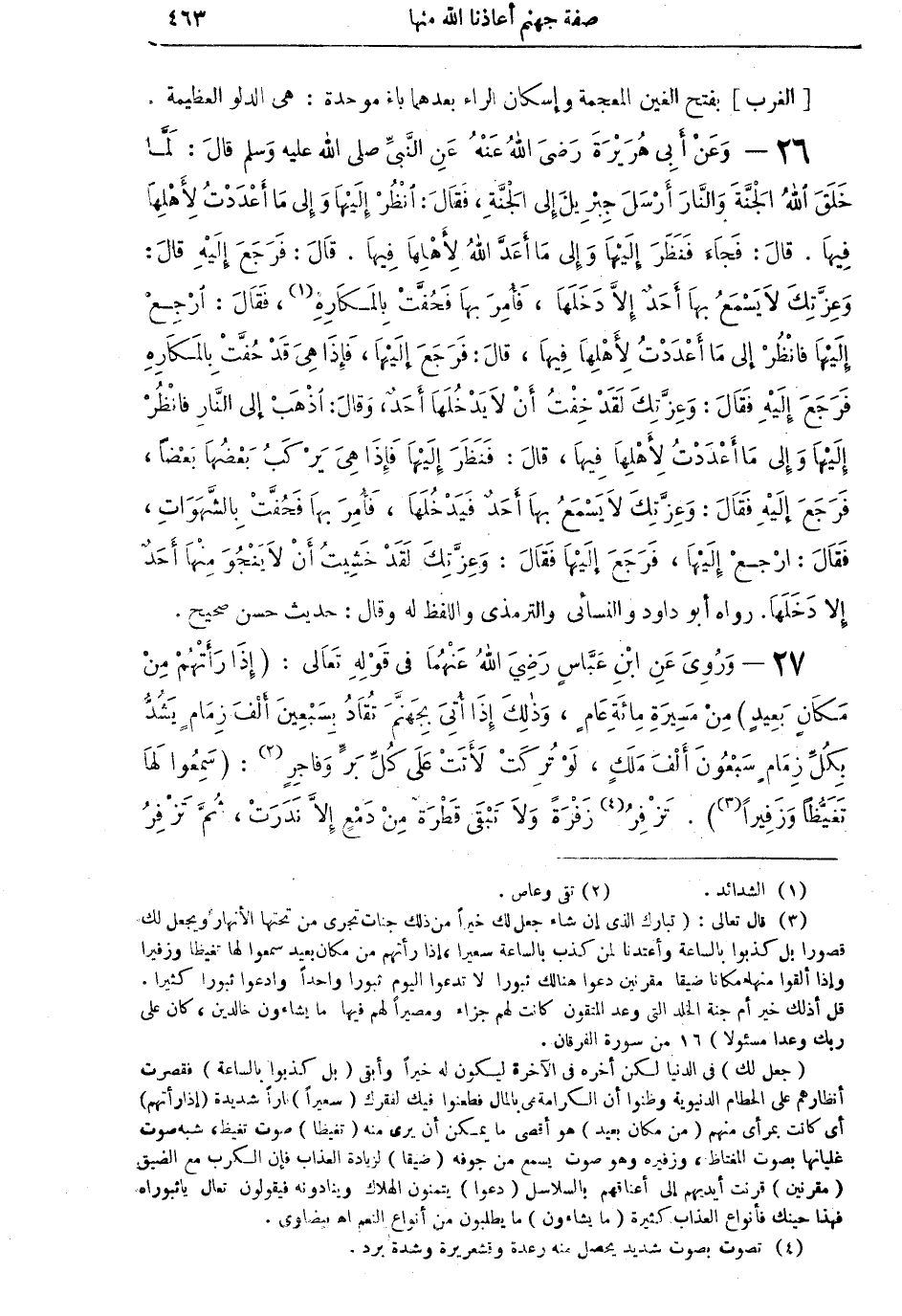 27 - وَرُوِيَ عَنِ ابْنِ عَبَّاسٍ رَضِيَ اللهُ عَنْهُمَا في قَوْلِهِ تَعَالَى: [إِذَا رَأَتْهُمْ مِنْ مَكَانٍ بَعِيدٍ] مِنْ مَسِيرَةِ مِائَةِ عَامٍ، وذلِكَ إِذَا أُتِيَ بِجَهَنَّمَ تُقَادُ بِسَبْعِينَ أَلْفَ زِمَامٍ يُشَدُّ بِكُلِّ زِمَامٍ سَبْعُونَ أَلْفَ مَلَكٍ، لَوْ تُرِكَتْ لأَتَتْ عَلَى كُلِّ بَرٍّ وَفاجِرٍ (¬2): [سَمِعُوا لَهَا تَغَيُّظاً وَزَفِيراً (¬3)]. تَزْفِرُ (¬4) زَفْرَةً وَلاَ تَبْقَى قَطْرَةٌ مِنْ دَمْعٍ إِلاَّ نَدَرَتْ، ثُمَّ تَزْفِرُ