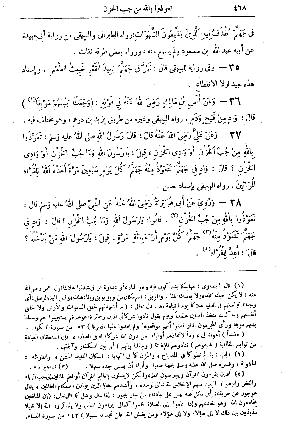 38 - وَرُوِيَ عَنْ أَبِي هُرَيْرَةَ رضِيَ اللهُ عَنْهُ عَنِ النَّبِيِّ صلى اللهُ عليه وسلم قال: تَعَوَّذُوا بِاللهِ مِنْ جُبِّ الْحَزْنِ (¬2) قالُوا: يا رَسُولَ اللهِ وَمَا جُبُّ الْحَزْنِ؟ قالَ: وَادٍ في جَهَنَّمَ تَتَعَوَّذُ مِنْهُ (¬3) جَهَنَّمُ كُلَّ يَوْمٍ أَرْبَعَمَائَةِ مَرَّةٍ. قِيلَ: يَا رَسُولَ اللهِ مَنْ يَدْخُلُهُ؟ قالَ: أُعِدَّ لِلْقُرَّاءِ (¬4).