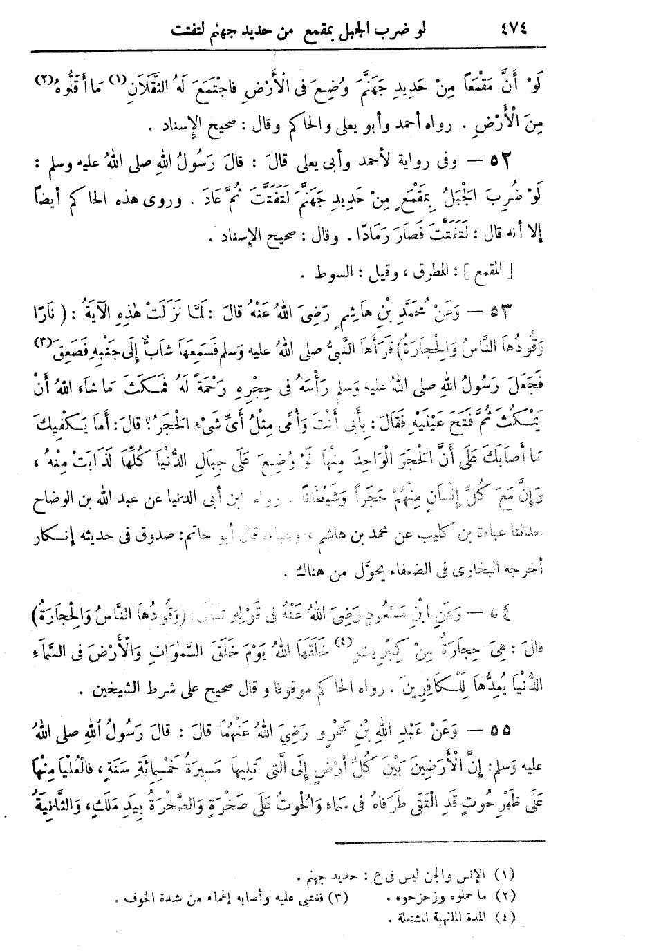 54 - وَعَنِ ابْنِ مَسْعُودٍ رَضِيَ اللهُ عَنْهُ في قَوْلِهِ تَعَالَى: [وَقُودُهَا النَّاسُ والْحِجَارَة] قالَ: هِيَ حِجَارَةٌ مِنْ كِبْرِيتٍ (¬4) خَلَقَهَا اللهُ يَوْمَ خَلَقَ السَّمَواتِ والأَرْضَ في السَّمَاءِ الدُّنْيَا يُعِدُّهَا لِلْكَافِرِينَ. رواه الحاكم موقوفاً وقال: صحيح على شرط الشيخين.