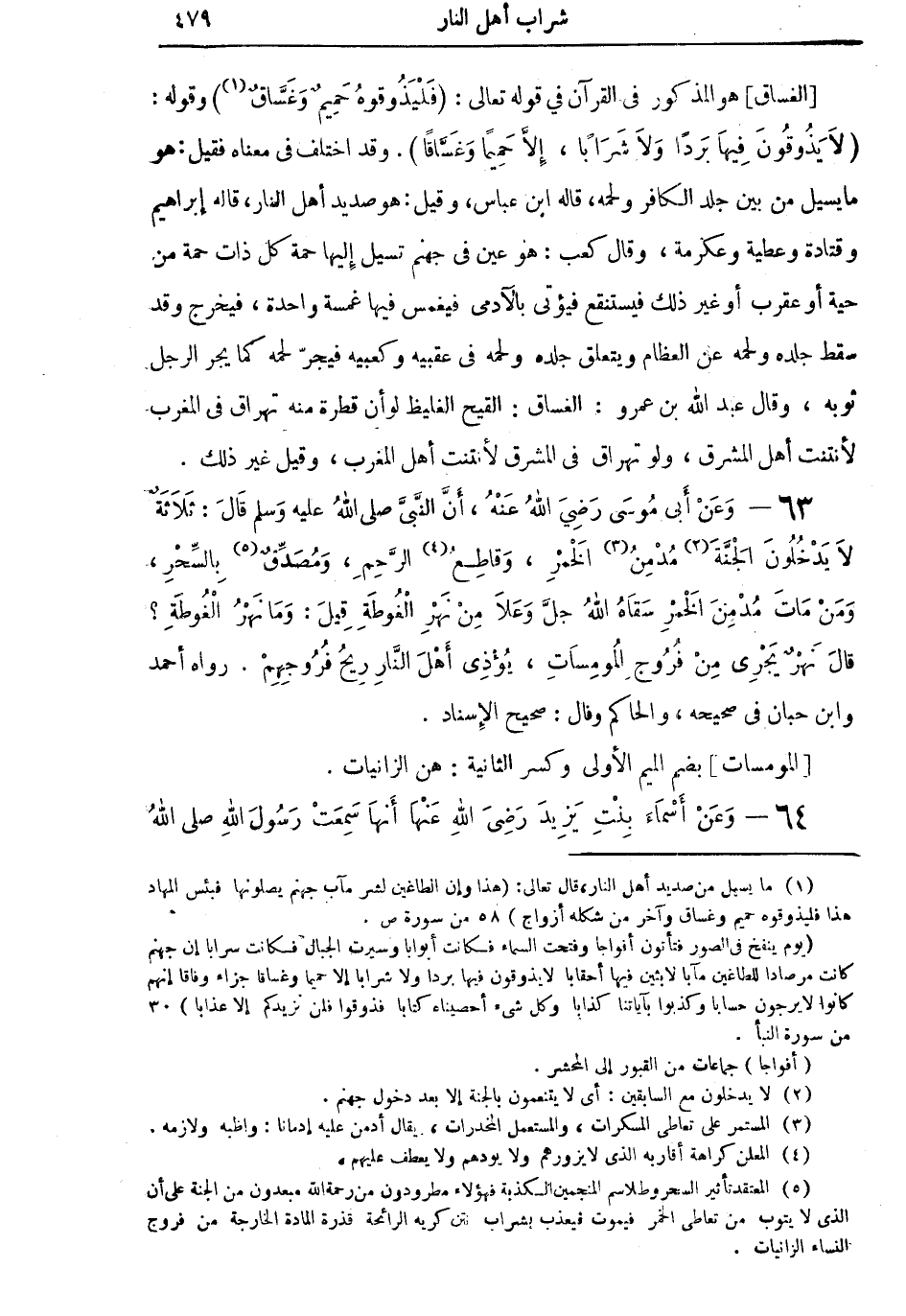 63 - وَعَنْ أَبِي مُوسَى رَضِيَ اللهُ عَنْهُ، أَنَّ النَّبِيَّ صلى اللهُ عليه وسلم قالَ: ثلاثَةٌ لاَ يَدْخُلُونَ الْجَنَّةَ (¬2) مُدْمِنُ (¬3) الْخَمْرِ، وَقاطِعُ (¬4) الرَّحِمِ، وَمُصَدِّقٌ (¬5) بِالسِّحْرِ، وَمَنْ مَاتَ مُدْمِنَ الْخَمْرِ سَقَاهُ اللهُ جَلَّ وَعَلا مِنْ نَهْرِ الْغُوطَةِ قِيلَ: وَمَا نَهْرُ الْغُوطَةِ؟ قالَ: نَهْرٌ يَجْرِي مِنْ فُرُوجِ الْمُومِسَاتِ، يُؤْذِي أَهْلَ النَّارِ رِيحُ فُرُوجِهِمْ. رواه أحمد وابن حبان في صحيحه، والحاكم وقال: صحيح الإسناد.