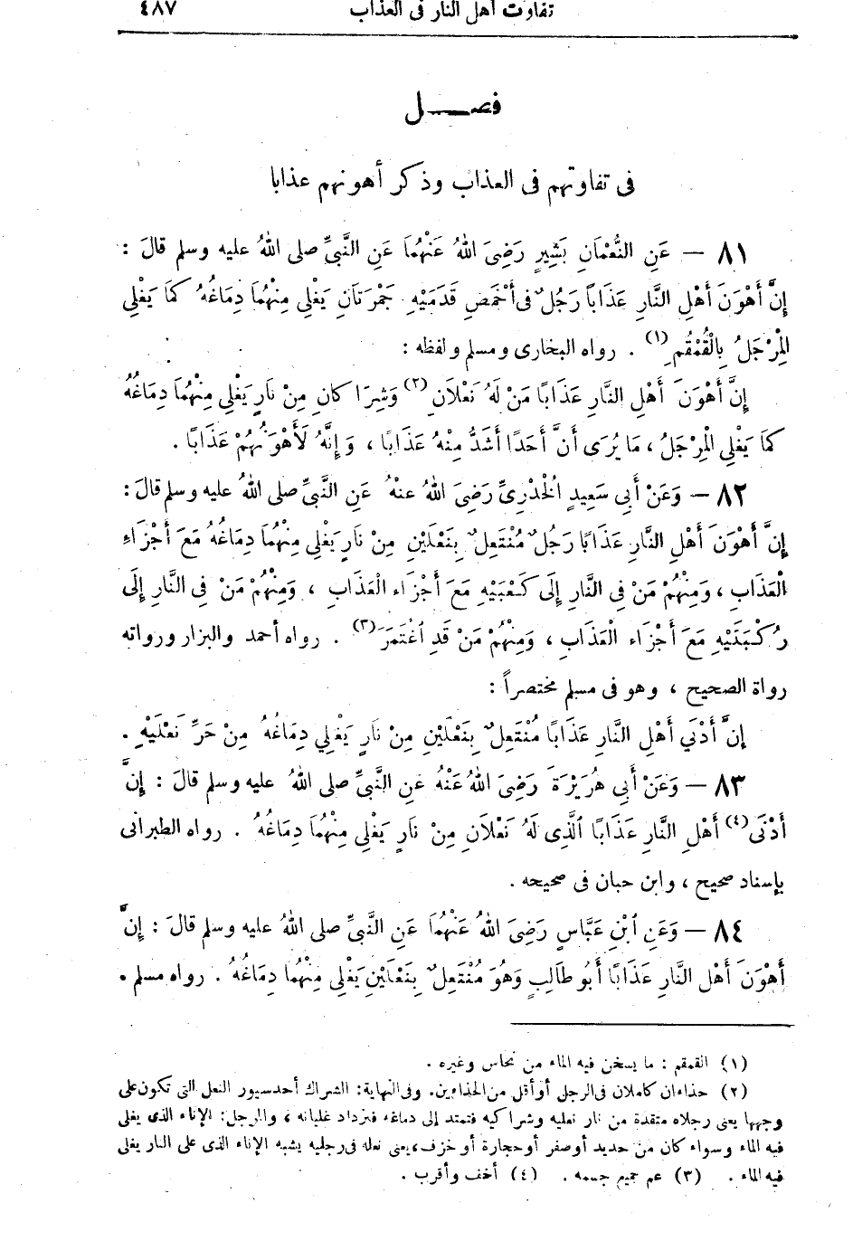 81 - عَنِ النُّعْمَانِ بْنِ بَشِيرٍ رَضِيَ اللهُ عَنْهُمَا عَنِ النَّبِيِّ صلى اللهُ عليه وسلم قالَ: إِنَّ أَهْوَنَ أَهْلِ النَّارِ عَذَاباً رَجُلٌ في أَخْمَصِ قَدَمَيْهِ جَمْرَتَانِ يَغْلِي مِنْهُمَا دِمَاغُهُ كما يَغْلِي الْمِرْجَلُ بِالْقُمْقُمِ (¬1). رواه البخاري ومسلم ولفظه: