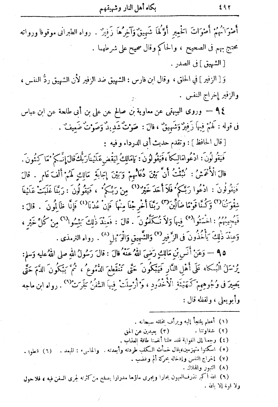 94 - وروى البيهقي عن معاوية بن صالح عن علي بن أبي طلحة عن ابن عباس في قوله: لَهُم فِيْهَا زَفِيرٌ وَشَهِيقٌ، قالَ: صَوْتٌ شَدِيدٌ وَصَوْتٌ ضَعِيفٌ.