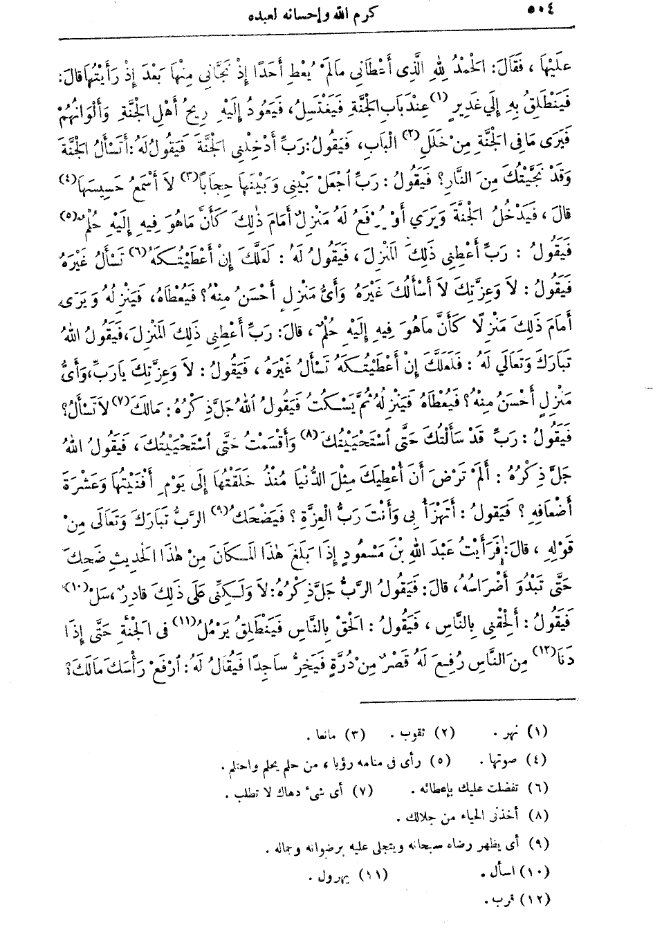 عَلَيْهَا، فَقَالَ: الْحَمْدُ للهِ الَّذِي أَعْطَانِي مَا لَمْ يُعْطِ أَحَداً إِذْ نَجَّانِي مِنْهَا بعْدَ إِذْ رَأَيْتُهَا قالَ: فَيَنْطَلِقُ بِهِ إِلى غَدِيرٍ (¬1) عِنْدَ بَابِ الْجَنَّةِ فَيَغْتَسِلُ، فَيَعُودُ إِلَيْهِ رِيحُ أَهْلِ الْجَنَّةِ وَأَلْوَانُهُمْ فَيَرى مَا فِي الْجَنَّةِ مِنْ خَلَلِ (¬2) الْبَابِ، فَيَقُولُ: رَبِّ أَدْخِلْنِي الْجَنَّةَ فَيَقُولُ لَهُ: أَتَسْأَلُ الْجَنَّةَ وَقَدْ نَجَّيْتُكَ مِنَ الْنَّارِ؟ فَيَقُولُ: رَبِّ اجْعَلْ بَيْنِي وَبَيْنَهَا حِجَاباً (¬3) لاَ أَسْمَعُ حَسِيسَهَا (¬4) قالَ، فَيَدْخُلُ الْجَنَّةَ وَيَرَى أَوْ يَرْفَعُ لَهُ مَنْزِلٌ أَمَامَ ذَلِكَ كَأَنَّ مَا هُوَ فِيهِ إِلَيْهِ حُلْمٌ (¬5) فَيَقُولُ: رَبِّ أَعْطِنِي ذَلِكَ المَنْزِلَ، فَيَقُولُ لَهُ: لَعَلَّكَ إِنْ أَعْطَيْتُكَهُ (¬6) تَسْأَلُ غَيْرَهُ فَيَقُولُ: لاَ وَعِزَّتِكَ لا أَسْأَلُكَ غَيرَه وَأَيُّ مَنْزِلٍ أَحْسَنُ مِنْهُ؟ فَيُغْطَاهُ، فَيَنْزِلُهُ وَيَرَى أَمَامَ ذَلِكَ مَنْزِلاً كَأَنَّ مَا هُوَ فِيهِ إِلَيْهِ حُلْمٌ، قالَ: رَبِّ أَعْطِنِي ذلِكَ الْمَنْزِلَ، فَيَقُولُ اللهُ تَبَاركَ وتَعَالَى لَهُ: فَلَعَلَّكَ إِنْ أَعْطَيْتُكَهُ تَسْأَلُ غَيْرَهُ، فَيَقُولُ: لاَ وَعِزَّتِكَ يَا رَبِّ، وَأَيُّ مَنْزِلٍ أَحْسَنُ مِنْهُ؟ فَيُعْطَاهُ فَيَنْزِلُهُ ثُمَّ يَسْكُتُ فَيَقُولُ اللهُ جَلَّ ذِكْرُهُ: مَالَكَ (¬7) لاَ تَسْأَلُ؟ فَيَقُولُ رَبِّ: قَدْ سَأَلْتُكَ حَتَّى اسْتَحْيَيْتُكَ (¬8)