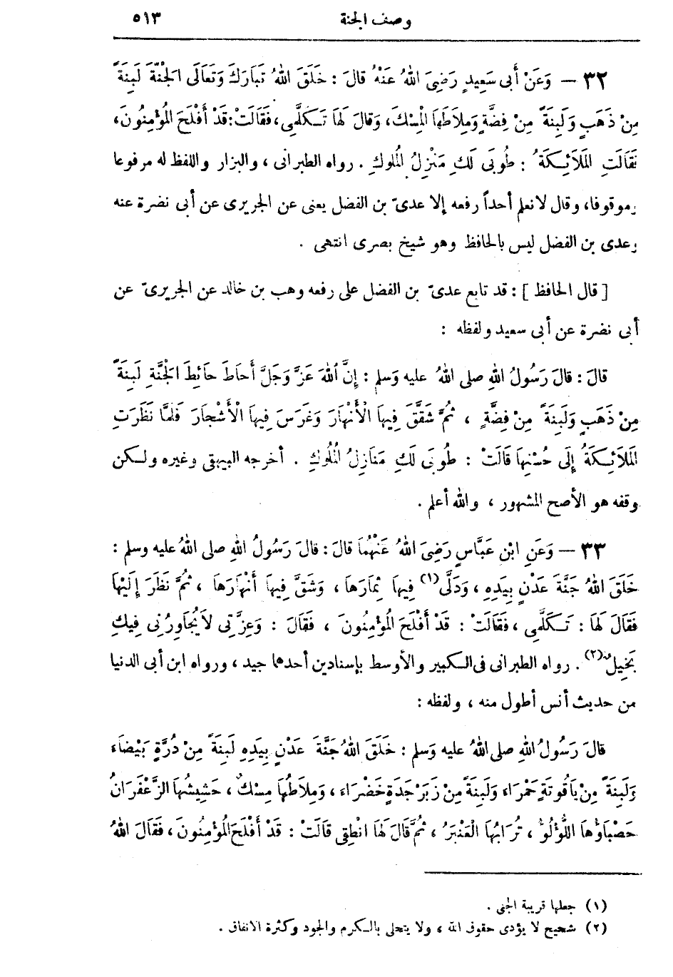 32 - وَعَنْ أَبِي سَعِيد رَضِيَ اللهُ عَنْهُ قالَ: خَلَقَ اللهُ تَبَارَكَ وَتَعَالَى الْجَنَّةَ لَبِنَةً مِنْ ذَهَبٍ وَلَبِنَةً مِنْ فِضَّةٍ وَمِلاطهَا الْمِسْكُ، وَقالَ لَهَا تَكَلَّمِي، فَقَالَتْ: قَدْ أَفْلَحَ الْمُؤْمِنُونَ، فَقَالَتِ الْمَلائِكَةُ: طُوبَى لَكِ مَنْزِلُ الْمُلُوكِ. رواه الطبراني، والبزار واللفظ له مرفوعاً وموقوفاً، وقال لا نعلم أحداً رفعه إلا عديّ بن الفضل يعني عن الجريري عن أبي نضرة عنه وعدي بن الفضل ليس بالحافظ وهو شيخ بصرى انتهى.
