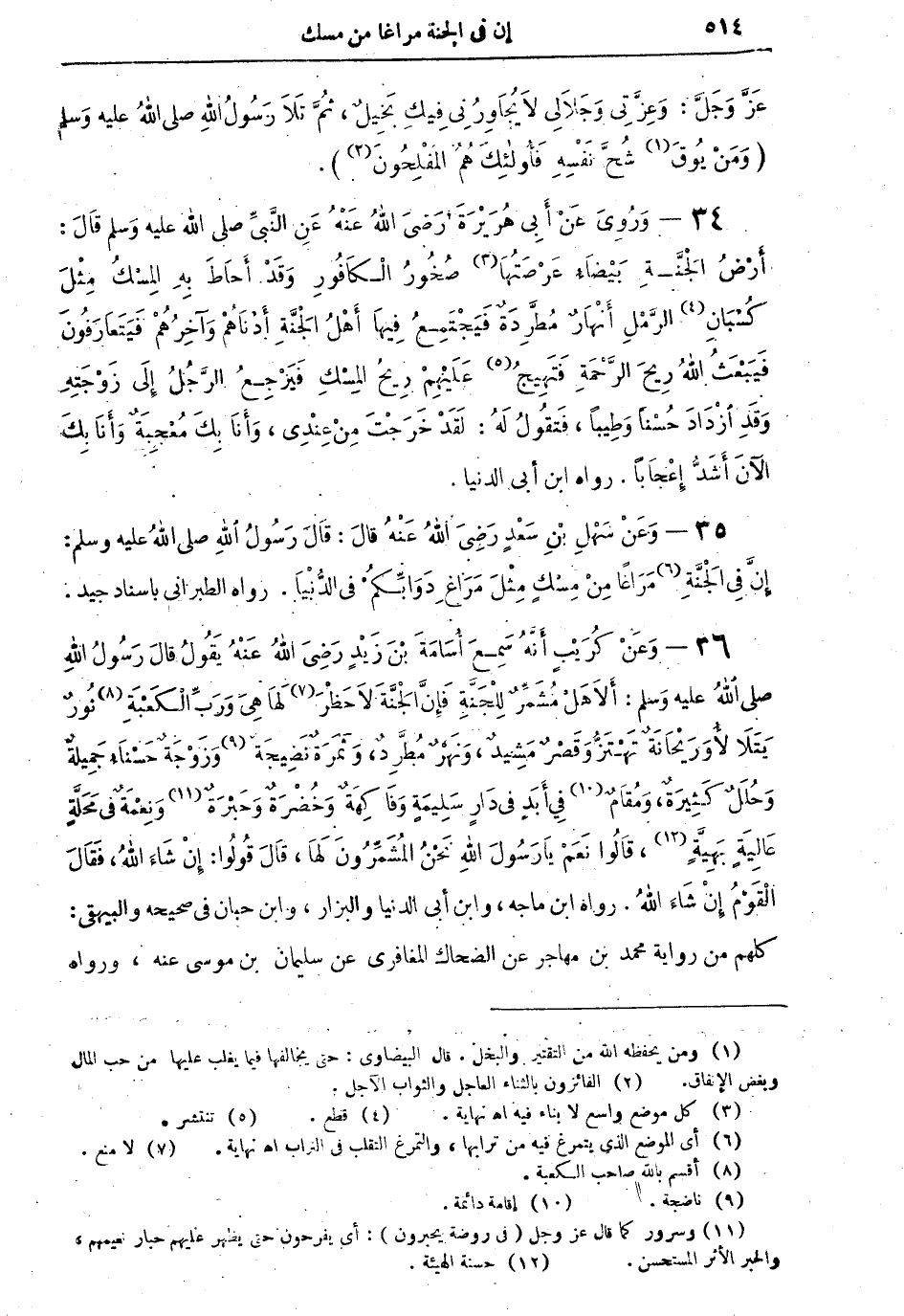 36 - وَعَنْ كُرَيْبٍ أَنَّهُ سَمِعَ أُسَامَةَ بْنَ زَيْدٍ رَضِيَ اللهُ عَنْهُ يَقُولُ قالَ رَسُولُ اللهِ صلى اللهُ عليه وسلم: أَلاَ هَلْ مُشَمِّرٌ لِلْجَنَّةِ فَإِنَّ الْجَنَّةَ لاَ حَظْرَ (¬7) لَهَا هِيَ وَرَبِّ الْكَعْبَةِ (¬8) نُورٌ يَتَلأْلأُ وَرَيْحَانَةٌ تَهْتَزُّ وَقَصْرٌ مَشِيدٌ، وَنَهْرٌ مُطَّرِدٌ، وَثَمَرَةٌ نَضِيجَةٌ (¬9) وَزَوْجَةٌ حَسْنَاءُ جَمِيلَةٌ وَحُلَلٌ كَثِيرَةٌ، وَمُقَامٌ (¬10) فِي أَبَدٍ فِي دَارٍ سَلِيمَةٍ وَفَاكِهَةٌ وَخُضْرَةٌ وَحَبْرَةٌ (¬11) وَنِعْمَةٌ فِي مَحَلَّةٍ عَالِيَةٍ بَهِيَّةٍ (¬12)، قالُوا نَعَمْ يَا رَسُولَ اللهِ نَحْنُ الْمُشَمِّرُونَ لَهَا، قالَ قُولُوا إِنْ شاءَ اللهُ، فَقَالَ الْقَوْمُ إِنْ شَاءَ اللهُ رواه ابن ماجة، وابن أبي الدنيا والبزار، وابن حبان في صحيحه والبيهقي: كلهم من رواية محمد بن مهاجر عن الضحاك المغافري عن سليمان بن موسى عنه، ورواه
