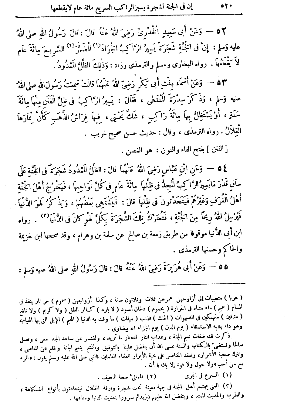 54 - وَعَنِ ابْنِ عَبَّاسٍ رَضِيَ اللهُ عَنْهُمَا قالَ: الظِّلُّ الْمَمْدُودُ شَجَرَةٌ في الْجَنَّةِ عَلَى سَاقٍ قَدْرَ مَا يَسِيرُ الرَّاكِبُ الْمُجِدُّ في ظِلِّهَا مِائَةَ عَامٍ في كُلِّ نَوَاحِيهَا، فَيَخْرُجُ أَهْلُ الْجَنَّةِ أَهْلُ الْغُرَفِ وَغَيْرُهُمْ فَيَتَحَدَّثُونَ في ظِلِّهَا قالَ: فَيَشْتَهِي بَعْضُهُمْ، وَيَذْكُرُ لَهوَ الدُّنْيَا فَيُرْسِلُ اللهُ رِيحاً مِنَ الْجَنَّةِ، فَتُحَرِّكُ تِلْكَ الشَّجَرَةَ بِكُلِّ لَهْوٍ كانَ في الدُّنْيَا (¬3). رواه ابن أبي الدنيا موقوفاً من طريق زمعة بن صالح عن سلمة بن وهرام، وقد صححها ابن خزيمة والحاكم وحسنها الترمذي.
