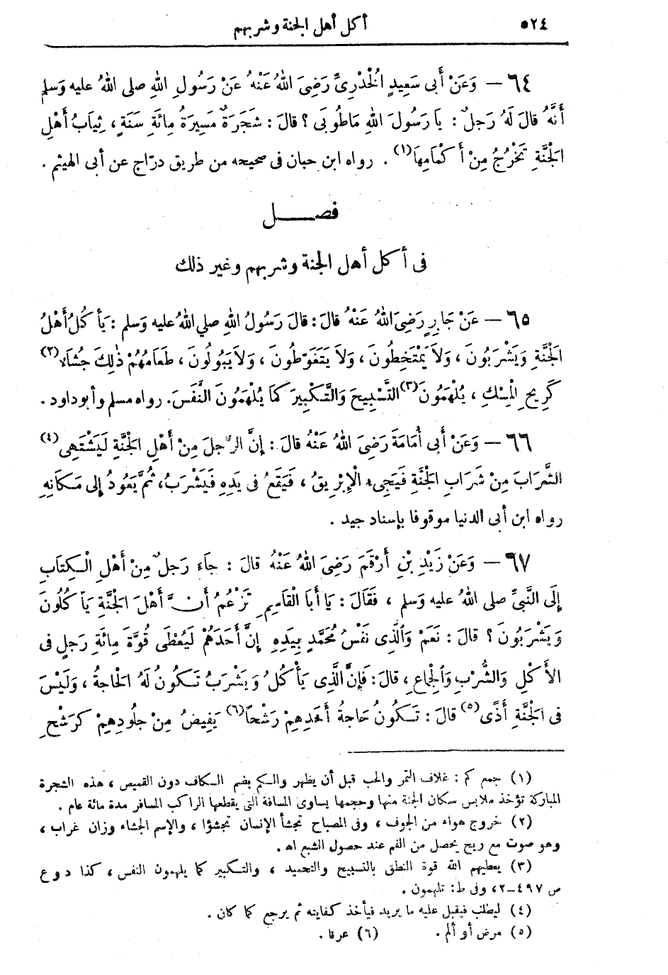 67 - وَعَنْ زَيْدِ بْنِ أَرْقَمَ رَضِيَ اللهُ عَنْهُ قالَ: جَاءَ رَجُلٌ مِنْ أَهْلِ الْكِتَابِ إِلى النَّبِيِّ صلى اللهُ عليه وسلم، فَقَالَ يَا أَبَا الْقاسِم: تَزْعُمُ أَنَّ أَهْلَ الْجَنَّةِ يَأْكُلُونَ وَيَشْرَبُونَ؟ قالَ نَعَمْ: والَّذِي نَفْسُ مُحَمَّدٍ بِيَدِهِ إِنَّ أَحَدَهُمْ لَيُعْطَى قُوَّةَ مَائَةِ رَجُلٍ في الأَكْلِ والشُّرْبِ والْجِمَاعِ، قالَ: فَإِنَّ الَّذِي يَأْكُلُ وَيَشْرَبُ تَكُونُ لَهُ الْحَاجَةُ، وَلَيْسَ في الْجَنَّةِ أذَى (¬5) قالَ: تَكُونُ حَاجَةُ أَحَدِهِمْ رَشْحاً (¬6) يَفِيضُ مِنْ جُلُودِهِمْ كَرَشْح