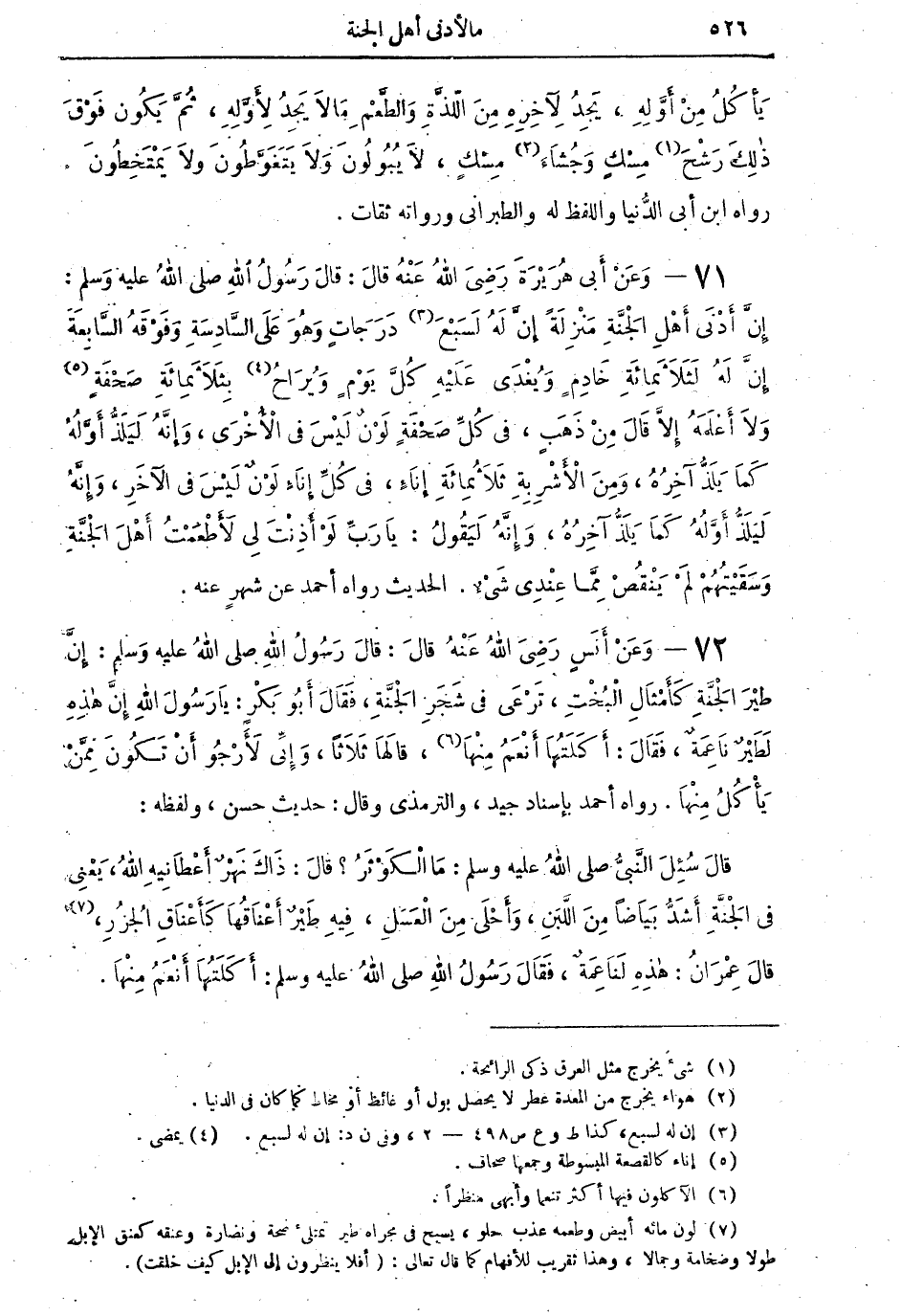 72 - وَعَنْ أَنَسٍ رَضِيَ اللهُ عَنْهُ قالَ: قالَ رَسُولُ اللهِ صلى اللهُ عليه وسلم: إِنَّ طَيْرَ الْجَنَّةِ كَأَمْثَالِ الْبُخْتِ، تَرْعَى في شَجَرِ الْجَنَّةِ، فَقَالَ أَبُو بَكْرٍ: يَا رَسُولَ اللهِ إِنَّ هَذِهِ لَطَيْرٌ نَاعِمَةٌ، فَقَالَ: أَكَلَتُهَا أَنْعَمُ مِنْهَا (¬6): قالها ثلاثاً، وَإِنِّي لأَرْجُو أَنْ تَكُونَ مِمَّنْ يَأْكُلُ مِنْهَا. رواه أحمد بإسناد جيد، والترمذي وقال: حديث حسن ولفظه: