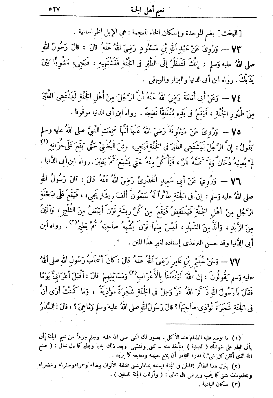 76 - وَرُوِيَ عَنْ أَبِي سَعِيدٍ الْخُدْرِيِّ رَضِيَ اللهُ عَنْهُ قالَ: قالَ رَسُولُ اللهِ صلى اللهُ عليه وسلم: إِنَّ في الْجَنَّةِ طَائِراً لَهُ سَبْعُونَ أَلْفَ رِيشَةٍ يَجِيء، فَيَقَعُ عَلَى صَحْفَةِ الرَّجُلِ مِنْ أَهْلِ الْجَنَّةِ فَيَنْتَفِضُ فَيَقَعُ مِنْ كُلِّ رِيشَةٍ لَوْنٌ أَبْيَضُ مِنَ الثَّلْجِ، وَأَلْيَنُ مِنَ الزُّبْدِ، وَأَلَذُّ مِنَ الشَّهْدِ. لَيْسَ مِنْهَا لَوْنٌ يُشْبِهُ صَاحِبَهُ ثُمَّ يَطِيرُ (¬2). رواه ابن أبي الدنيا وقد حسن الترمذي إسناده لغير هذا المتن.