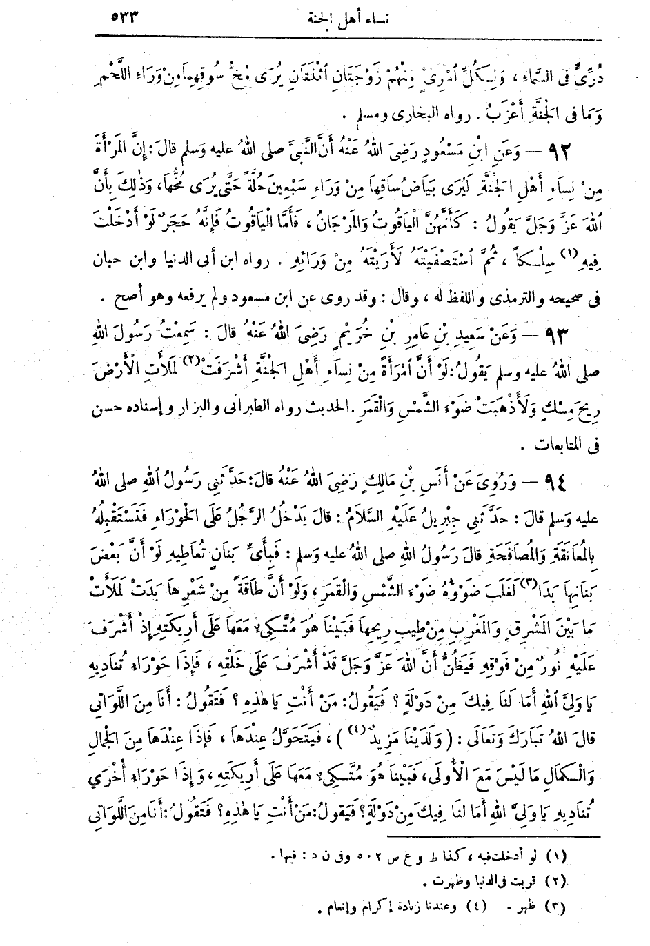 94 - وَرُوِيَ عَنْ أَنَس بْنِ مَالِكٍ رَضِيَ اللهُ عَنْهُ قالَ: حَدَّثَنِي رَسُولُ اللهِ صلى اللهُ عليه وسلم: قالَ حَدَّثَنِي جِبْرِيلُ عَلَيْهِ السَّلام: قالَ يَدْخُلُ الرَّجُلُ عَلَى الْحَورَاءِ فَتَسْتَقْبِلُهُ بِالْمُعَانَقَةِ وَالْمُصَافَحَةِ قالَ رَسُولُ اللهِ صلى اللهُ عليه وسَلَّم: فَبِأَيِّ بَنَان تُعَاطِيهِ لَوْ أَنَّ بَعْضَ بِنَانِهَا بَدَا (¬3) لَغَلَبَ ضَوْءُهُ ضَوْءَ الشَّمْسِ وَالْقَمَرِ، وَلَوْ أَنَّ طاقَةً مِنْ شَعرِهَا بَدَتْ لملأَتْ مَا بَيْنَ الْمَشْرِقِ وَالْمَغْرِبِ مِنْ طِيبِ رِيحِهَا فَبَيْنَا هُوَ مُتَّكِئٌ مَعَهَا عَلَى أَرِيكَتِهِ إِذْ أَشْرَفَ عَلَيْهِ نُورٌ مِنْ فَوْقِهِ فَيَظُنُّ أَنَّ اللهَ عَزَّ وَجَلَّ قَدْ أَشْرَفَ عَلَى خَلْقِهِ، فَإِذَا حَوْرَاءُ تُنَادِيهِ يَا وَلِيَّ اللهِ أَمَالَنَا فِيكَ مِنْ دَوْلَةٍ؟ فَيَقُولُ مَنْ أَنْتِ يَا هذِهِ؟ فَتَقُولُ: أَنَا مِنَ اللَّوَاتِي قالَ اللهُ تَبَارَكَ وَتَعَالى: [وَلَدَيْنَا مَزِيدٌ (¬4)]، فَيَتَحَوَّلُ عِنْدَهَا، فَإِذَا عِنْدَهَا مِنَ الْجَمَالِ وَالْكَمَالِ مَا لَيْسَ مَعَ الأُولَى، فَبَيْنَا هُوَ مُتَّكِئٌ مَعَهَا عَلى أَرِيكَتِهِ، وَإِذَا حَوْرَاءُ أُخْرَى تُنَادِيهِ يَا وَلِيَّ اللهِ أَمَا لَنَا فِيكَ مِنْ دَوْلَةٍ؟ فَيَقُولُ: مَنْ أَنْتِ يَا هذِه؟ فَتَقُولُ: أَنَا مِنَ اللَّوَاتِي