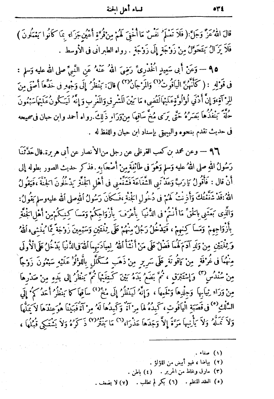 95 - وَعَنْ أَبِي سَعِيدٍ الْخُدْرِيِّ رَضِيَ اللهُ عَنْهُ عَنِ النَّبِيِّ صلى اللهُ عليه وسلم: في قَوْلِهِ: [كأَنَّهُنَّ الْيَاقُوتُ (¬1) وَالْمَرْجَان (¬2)] قالَ: يَنْظُرُ إِلى وَجْهِهِ في خَدِّهَا أَصْفَى مِنَ الْمِرْآةِ، وَإِنَّ أَدْنَى لُؤْلُؤَةٍ عَلَيْهَا لَتُضِيءُ مَا بَيْنَ الْمَشْرِقِ وَالْمَغْرِبِ وَإِنَّهُ لَيَكُونُ عَلَيْهَا سَبْعُونَ حُلَّةً ينْفُذُهَا بَصَرُهُ حَتَّى يَرَى مُخَّ سَاقِهَا مِنْ وَرَاءِ ذَلِكَ. رواه أحمد وابن حبان في صحيحه في حديث تقدم بنحوه والبيهقي بإسناد ابن حبان واللفظ له.