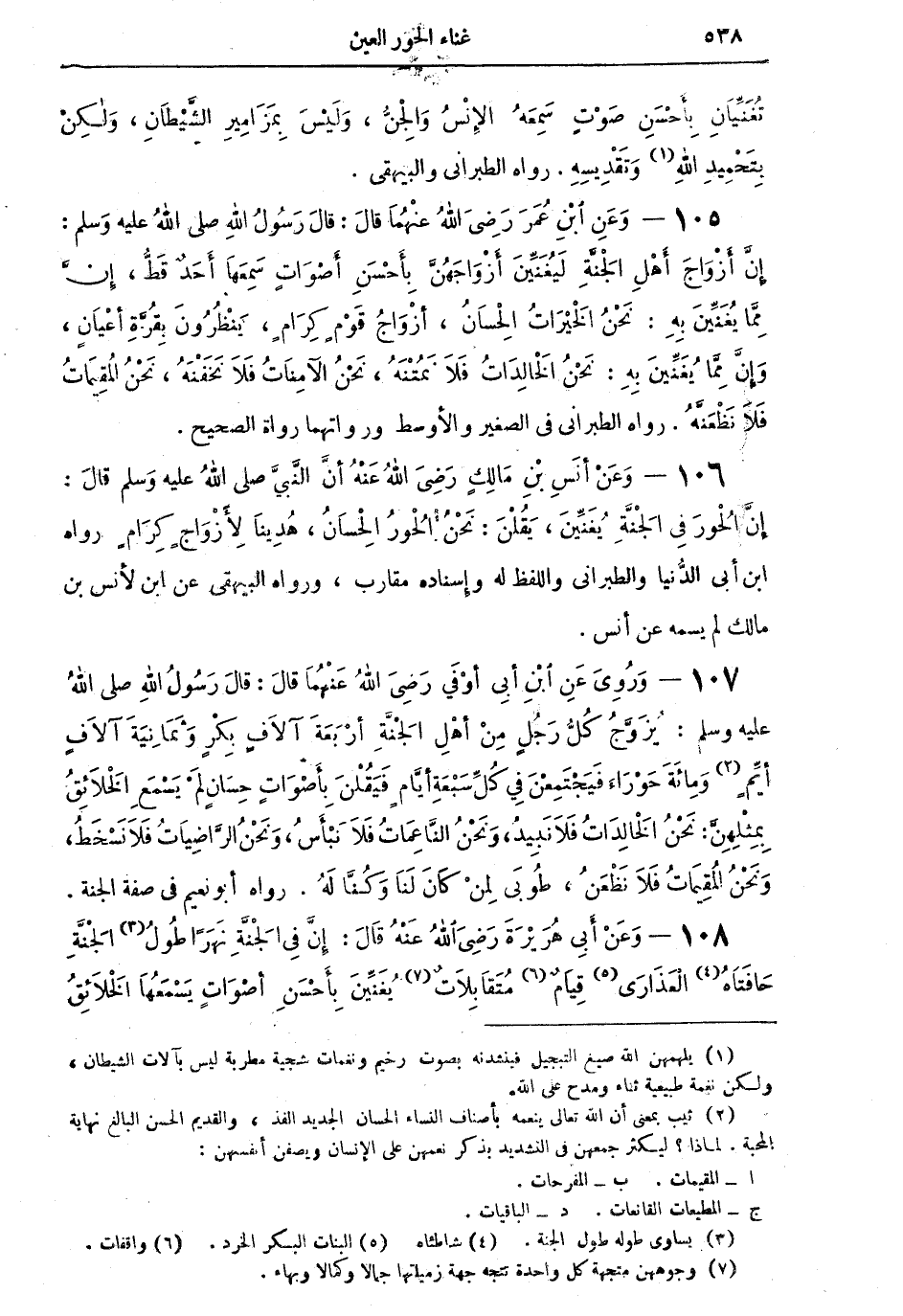 106 - وَعَنْ أَنَسِ بْنِ مَالِكٍ رَضِيَ اللهُ عَنْهُ أَنَّ النَّبيَّ صلى اللهُ عليه وسلم قالَ: إِنَّ الْحُورَ في الْجَنَّةِ يُغَنِّينَ، يَقُلْنَ: نَحْنُ الْحُورُ الْحِسَانُ، هُدِينا لأَزْوَاجٍ كِرَامٍ. رواه ابن أبي الدنيا والطبراني واللفظ له وإسناده مقارب، ورواه البيهقي عن ابنٍ لأنس بن مالك لم يسمه عن أنس.