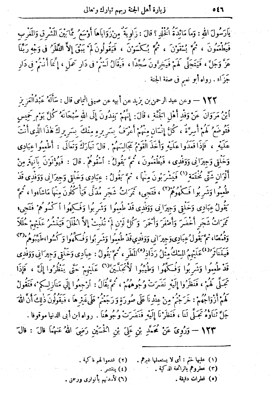 122 - وعن عبد الرحمن بن يزيد عن أبيه عن صفي اليمامي قالَ: سَأَلَهُ عَبْدُ الْعَزِيزِ بْنُ مَروانَ عَنْ وَفْدِ أَهْلِ الْجَنَّةِ، قالَ: إِنَّهُمْ يَفِدُونَ إِلى اللهِ سُبْحَانَهُ كُلَّ يَوْمِ خَمِيسٍ فَتُوضَعُ لَهُمْ أُسِرَّةٌ، كُلُّ إِنْسَانٍ مِنْهُمْ أَعْرَفُ بِسَرِيرِهِ مِنْكَ بِسَرِيرِكَ هذا الَّذِي أَنْتَ عَلَيْهِ، فَإِذَا قَعَدُوا عَلَيْهِ وَأَخَذَ الْقَوْمُ مَجَالِسَهُمْ. قالَ تَبَارَكَ وَتَعَالَى: أَطْعِمُوا عِبَادِي وَخَلْقِي وَجِيرَانِي وَوَفْدِي، فَيُطِعَمُونَ، ثُمَّ يَقُولُ: اسْقُوهُمْ. قالَ: فَيُؤْتَوْنَ بِآنِيَةٍ مِنْ أَلْوَانٍ شَتَّى مُخْتَمَةٍ (¬1) فَيَشْرَبُونَ مِنْهَا، ثُمَّ يَقُولُ: عِبَادِي وَخَلْقِي وَجِيرَانِي وَوَفْدِي قَدْ طُعِمُوا وَشَرِبُوا فَكِّهُوهُمْ (¬2)، فَتَجِيءُ ثَمَرَاتُ شَجَرٍ مُدَلَّى فَيَأْكُلُونَ مِنْهَا مَا شَاؤُوا، ثُمَّ يَقُولُ عِبَادِي وَخَلْقِي وَجِيرَانِي وَوَفْدِي قَدْ طُعِمُوا وَشَرِبُوا وَفَكِهُوا اكْسُوهُمْ فَتَجِيء ثَمَراتُ شَجَرٍ أَخْضَرَ وَأَصْفَرَ وَأَحْمَرَ وَكُلِّ لَوْنٍ لَمْ تُنْبِتْ إِلاَّ الْحُلَلَ فَيَنْشُرُ عَلَيْهِمْ حُللاً وَقُمْصاً، ثُمَّ يَقُولُ عِبَادِي وَجِيرَانِي وَوَفْدِي قَدْ طُعِمُوا وَشَرِبُوا وفُكِّهُوا وَكُسُوا، طَيِّبُوهُمْ (¬3) فَيَتَنَاثَرُ (¬4) عَلَيْهِمْ الْمِسْكُ مِثْلَ رَذَاذِ (¬5) الْمَطَرِ، ثُمَّ يَقُولُ: عِبَادِي وَخَلْقِي وَجِيرَانِي وَوَفْدِي قَدْ طُعِمُوا وَشَرِبُوا وَفُكِهُوا وَكُسُوا وَطُيِّبُوا لأَتَجَلَّيَنَّ (¬6)