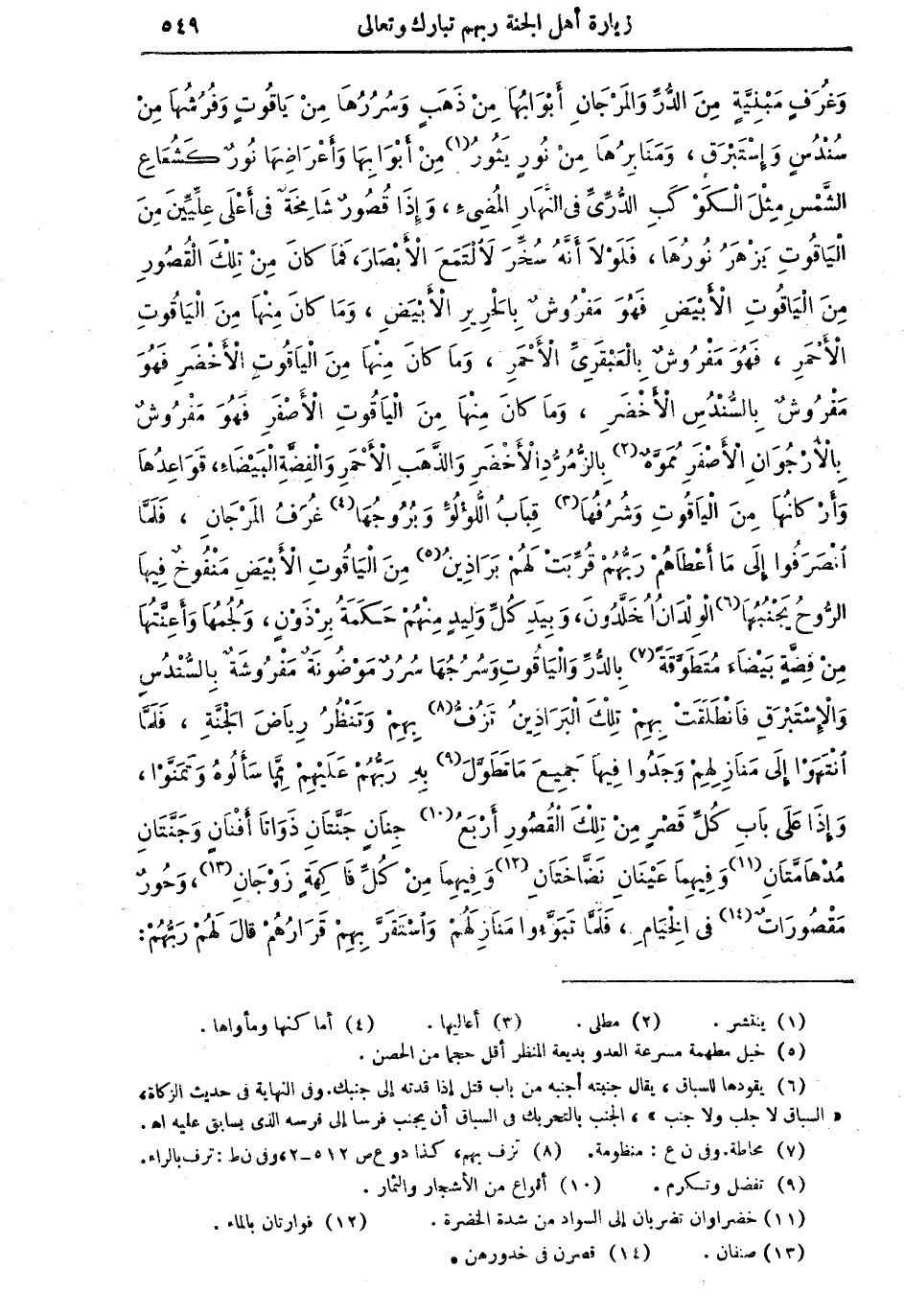 وَغُرَفٍ مَبْنِيَّةٍ مِنَ الدُّرِّ وَالْمَرْجَانِ أَبْوَابُهَا مِنْ ذَهَبٍ وَسُرُرُهَا مِنْ يَاقُوتٍ وَفُرُشُهَا مِنْ سُنْدِسٍ وَإِسْتَبْرَقٍ، وَمَنَابِرُهَا مِنْ نُورٍ يَثُورُ (¬1) مِنْ أَبْوَابِهَا وَأَعْرَاضِهَا نُورٌ كَشُعَاعِ الشَّمْسِ مِثْلَ الْكَوْكَبِ الدُّرِّيِّ في النَّهَارِ الْمُضِيءِ، وَإِذَا قُصُورٌ شَامِخَةٌ في أَعْلَى عِلِّيِّينَ مِنَ الْيَاقُوتِ يَزْهَرُ نُورُهَا، فَلَوْلاَ أَنَّهُ سُخِّرَ لالْتَمَعَ الأَبْصَارَ فَمَا كَانَ مِنْ تِلْكَ الْقُصُورِ مِنَ الْيَاقُوتِ الأَبْيَضِ، فَهُوَ مَفْرُوشٌ بِالْحَرِيرِ الأَبْيَضِ، وَمَا كَانَ مِنْهَا مِنَ الْيَاقُوتِ الأَحْمَرِ، فَهُوَ مَفْرُوشٌ بِالْعَبْقَرِيِّ الأَحْمَرِ، وَمَا كَانَ مِنْهَا مِنَ الْيَاقُوتِ الأَخْضَرِ فَهُوَ مَفْرُوشٌ بالسُّنْدُسِ الأَخْضَرِ، وَمَا كَانَ مِنْهَا مِنَ الْيَاقُوتِ الأَصْفَرِ فَهُوَ مَفْرُوشٌ بالأُرْجُوَانِ الأَصْفَرِ مُمَوَّهٌ (¬2) بِالزُّمُرُّدِ الأَخْضَرِ وَالذَّهَبِ الأَحْمَرِ وَالْفِضَّةِ الْبَيْضَاءِ، قَوَاعِدُهَا وَأَرْكَانُهَا مِنَ الْيَاقُوتِ وَشُرُفُهَا (¬3) قِبَابُ اللُّؤْلُؤِ وَبُرُوجُهَا (¬4) غُرَفُ الْمَرْجَانِ، فَلَمَّا انْصَرَفُوا إِلى مَا أَعْطَاهُمْ رَبُّهُمْ قُرِّبَتْ لَهُمْ بَرَاذِينُ (¬5) مِنَ الْيَاقُوتِ الأَبْيَضِ مَنْفُوخٌ فِيهَا الرُّوحُ يَجْنُبُهَا (¬6)