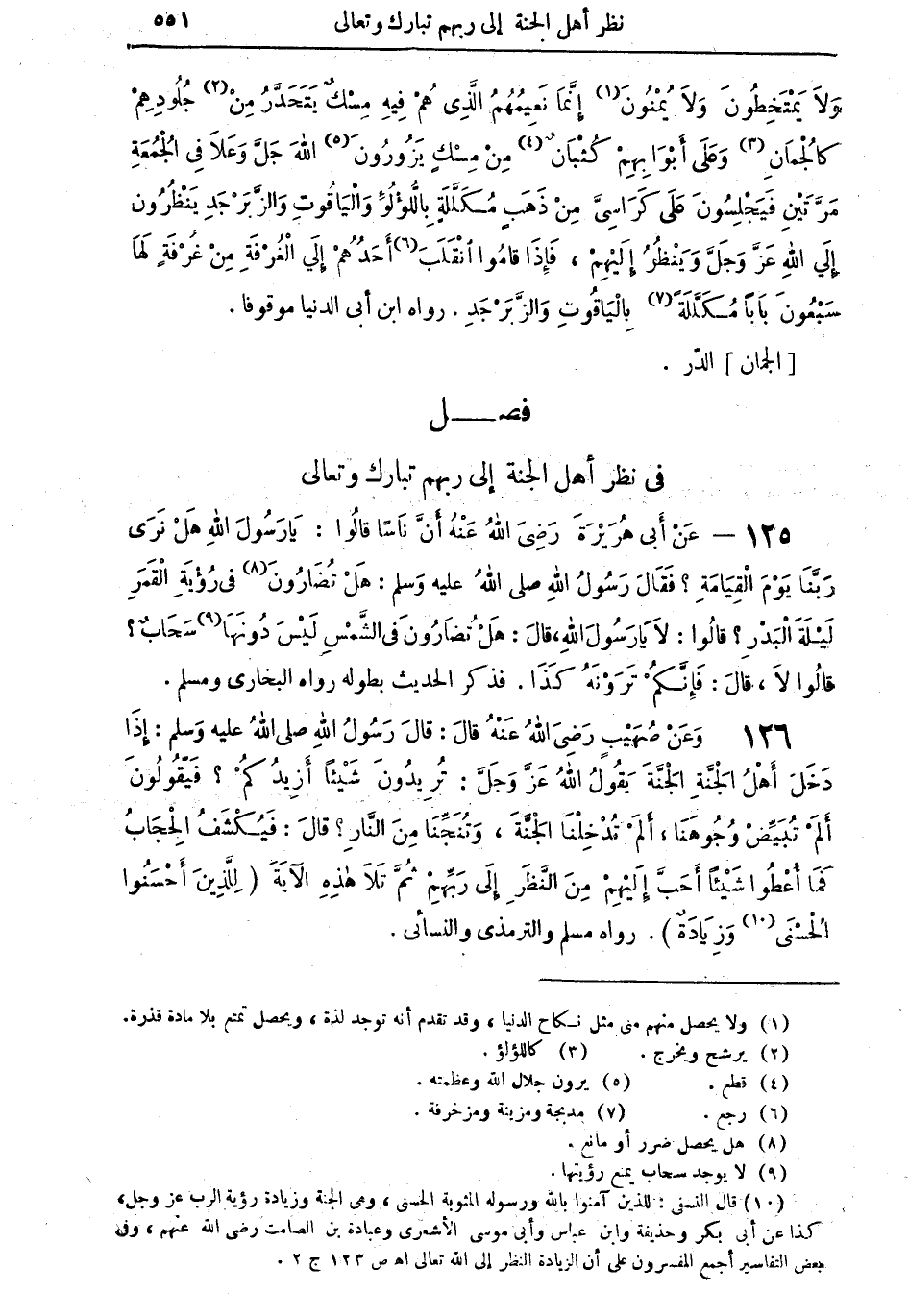126 - وَعَنْ صُهَيْبٍ رَضِيَ اللهُ عَنْهُ قالَ: قالَ رَسُولُ اللهِ صلى اللهُ عليه وسلم: إِذَا دَخَلَ أَهْلُ الْجَنَّةِ الْجَنَّةَ يَقُولُ اللهُ عَزَّ وَجَلَّ: تُرِيدُونَ شَيْئاً أَزِيدُكُمْ؟ فَيَقُولُونَ أَلَمْ تُبَيِّض وُجُوهَنَا، أَلَمْ تُدْخِلْنَا الْجَنَّةَ، وَتُنَجِّنَا مِنَ النَّارِ؟ قالَ: فَيُكْشَفُ الْحِجَابُ فَمَا أُعْطُوا شَيْئاً أَحَبَّ إِلَيْهِمْ مِنَ النَّظَرِ إِلى رَبِّهِمْ ثُمَّ تَلا هذِهِ الآيَةَ [لِلَّذِينَ أَحْسَنُوا الْحُسْنَى (¬10) وَزِيَادَةٌ]. رواه مسلم والترمذي والنسائي.
