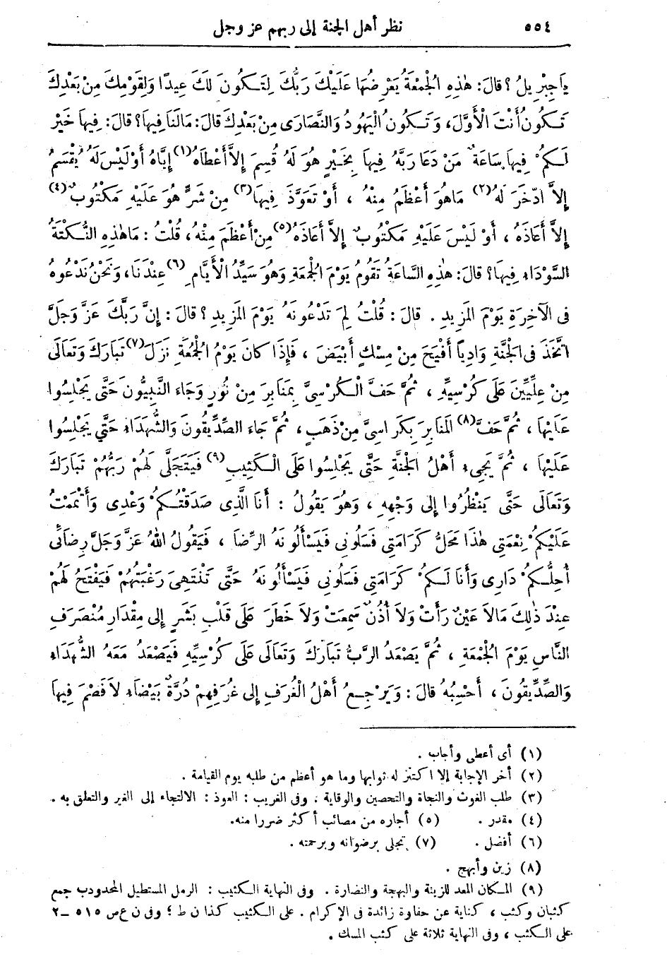 يَا جِبْرِيلُ؟ قالَ: هذِهِ الْجُمُعَةُ يَعْرِضُهَا عَلَيْكَ رَبُّكَ لِتَكُونَ لَكَ عِيداً وَلِقَوْمِكَ مِنْ بَعْدِكَ تَكُونُ أَنْتَ الأَوَّلَ، وَتَكُونُ الْيَهُودُ وَالنَّصَارَى مِنْ بَعْدِكَ قالَ: مَا لَنَا فِيهَا؟ قالَ: فِيهَا خَيْرٌ لَكُمْ فِيهَا سَاعَةٌ مَنْ دَعَا رَبَّهُ فِيهَا بِخَيْرٍ هُوَ لَهُ قُسِمَ إِلاَّ أَعْطَاهُ (¬1) إِيَّاهُ أَوْ لَيْسَ لَهُ يُقْسَمُ إِلاَّ ادّخَرَ لَهُ (¬2) مَا هُوَ أَعْظَمُ مِنْهُ، أَوْ تَعَوَّذَ فِيهَا (¬3) مِنْ شَرٍّ هُوَ عَلَيْهِ مَكْتُوبٌ (¬4) إِلاَّ أَعَاذَهُ، أَوْ لَيْسَ عَلَيْهِ مَكْتُوبٌ إِلاَّ أَعَاذَهُ (¬5) مِنْ أَعْظَمَ مِنْهُ، قُلْتُ: مَا هَذِهِ النُّكْتَةُ السَّوْدَاءُ فِيهَا؟ قالَ: هذِهِ السَّاعَةُ تَقُومُ يَوْمَ الْجُمْعَةِ وَهُوَ سَيِّدُ الأَيَّامِ (¬6) عِنْدَنَا، وَنَحْنُ نَدْعُوهُ في الآخِرَةِ يَوْمَ الْمَزِيدِ. قالَ: قُلْتُ لِمَ تَدْعُونَهُ يَوْمَ الْمَزِيدِ؟ قالَ: إِنَّ رَبَّكَ عَزَّ وَجَلَّ اتخذَ في الْجَنَّةِ وَادِياً أَفْيَحَ مِنْ مِسْكٍ أَبْيضَ، فَإِذَا كَانَ يَوْمُ الْجُمُعَةِ نَزَلَ (¬7) تَبَارَكَ وَتَعَالَى مِنْ عِلِّيِّينَ عَلَى كُرْسِيِّهِ، ثُمَّ حَفَّ الْكُرْسِيَّ بِمَنَابِرَ مِنْ نُورٍ وَجَاءَ النَّبِيُّونَ حَتَّى يَجْلِسُوا عَلَيْهَا، ثُمَّ حَفَّ (¬8)