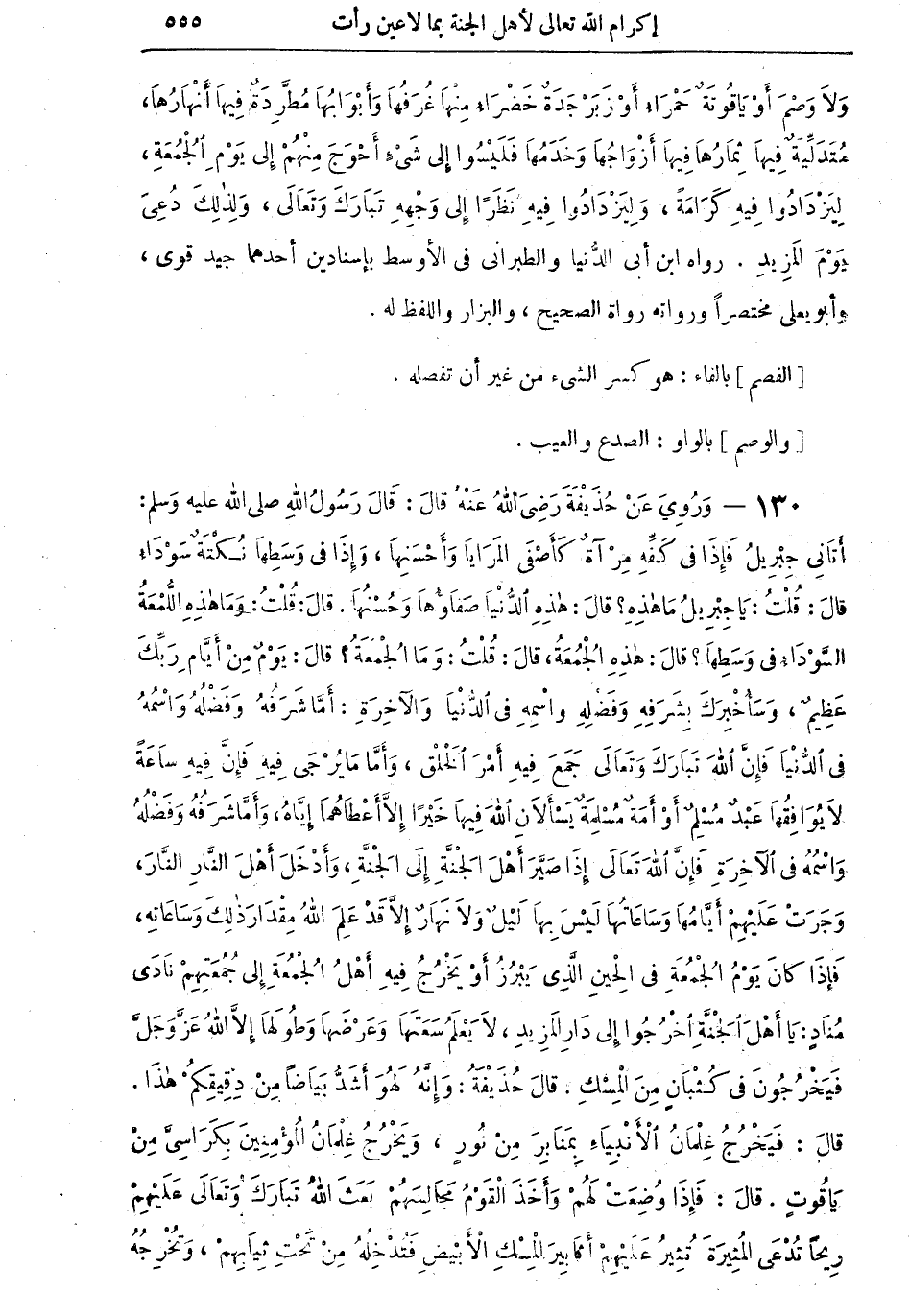 130 - وَرُوِيَ عَنْ حُذَيْفَةَ رَضِيَ اللهُ عَنْهُ قالَ: قالَ رَسُولُ اللهِ صلى اللهُ عليه وسلم: أَتَانِي جَبْرِيلُ فَإِذَا في كَفِّهِ مِرْآةٌ كَأَصْفَى الْمَرَايَا وَأَحْسَنِهَا، وَإِذَا في وَسَطِهَا نُكْتَةٌ سَوْدَاءُ قالَ: قَلْتُ: يَا جِبْرِيلُ مَا هذِهِ؟ قالَ: هَذِهِ الدُّنْيَا صَفَاؤُهَا وَحُسْنُهَا. قالَ: قُلْتُ: وَمَا هذِهِ اللُّمْعَةُ السَّوْدَاءُ في وَسَطِهَا؟ قالَ: هذِهِ الْجُمُعَةُ، قالَ: قُلْتُ: وَمَا الْجُمُعَةُ؟ قال: يَوْمٌ مِنْ أَيَّامِ رَبِّكَ عَظِيمٌ، وَسَأُخْبِرُكَ بِشَرَفِهِ وَفَضْلِهِ واسْمِهِ في الدُّنْيَا والآخِرَةِ: أَمَّا شَرَفَهُ وَفَضْلُهُ واسْمُهُ في الدُّنْيَا فَإِنَّ اللهَ تَبَارَكَ وَتَعَالَى جَمَعَ فِيهِ أَمْرَ الْخَلْق، وَأَمَّا مَا يُرْجَى فِيهِ فَإِنَّ فِيهِ سَاعَةً لاَ يُوافِقُهَا عَبْدٌ مُسْلِمٌ أَوْ أَمَةٌ مُسْلِمَةٌ يَسْأَلانِ اللهَ فيهَا خَيْراً إِلاَّ أَعْطَاهُمَا إِيَّاهُ، وَأَمَّا شَرَفُهُ وَفَضْلُهُ واسْمُهُ في الآخِرَةِ فَإِنَّ اللهَ تعَالى إِذَا صَيَّرَ أَهْلَ الْجَنَّةِ، إِلى الْجَنَّةِ، وَأَدْخَلَ أَهْلَ النَّارِ النَّارَ، وَجَرَتْ عَلَيْهِمْ أَيَّامُهَا وَسَاعَاتُهَا لَيْسَ بِهَا لَيْلٌ وَلا نَهَارٌ إِلاَّ قَدْ عَلِمَ اللهُ مِقْدَارَ ذَلِكَ وَسَاعَاتِه، فَإِذَا كَانَ يَوْمُ الْجُمُعَةِ في الْحِينِ الَّذِي يُبْرُزُ أَوْ يَخْرُجُ فِيهِ أَهْلُ الْجُمُعَةِ إِلى جُمُعَتِهِمْ نَادَى مُنَادٍ: يَا أَهْلَ الْجَنَّةِ اخْرُجُوا إِلى دَارِ الْمَزِيدِ، لاَ يَعْلَمُ سَعَتَهَا وَعَرْضَهَا وَطُولَهَا إِلاَّ اللهُ عَزَّ وَجَلَّ فَيَخْرُجُونَ في كُثْبَانٍ مِنَ الْمِسْكِ. قالَ حُذَيْفَةُ: وَإِنَّهُ لَهُوَ أَشَدُّ بَيَاضاً مِنْ دَقِيقِكُمْ هذَا.