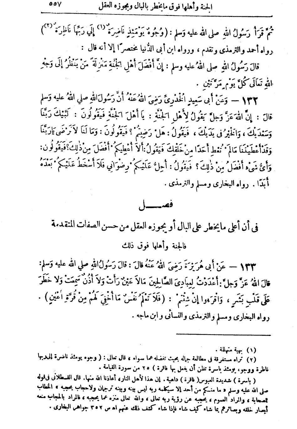 133 - عَنْ أَبِي هُرَيْرَةَ رَضِيَ اللهُ عَنْهُ قالَ: قالَ رَسُولُ اللهِ صلى اللهُ عليه وسلم: قالَ اللهُ عَزَّ وَجَلَّ: أَعْدَدْتُ لِعِبَادِيَ الصَّالِحِينَ مَا لاَ عَيْنٌ رَأَتْ وَلاَ أُذُنٌ سَمِعَتْ وَلا خَطَرَ عَلَى قَلْبِ بَشَرٍ، واقْرَؤوا إِنْ شِئْتُمْ: [فلاَ تَعْلَمُ نَفْسٌ مَا أُخْفِيَ لَهُمْ مِنْ قُرَّةِ أَعْيُنٍ]. رواه البخاري ومسلم والترمذي والنسائي وابن ماجة.
