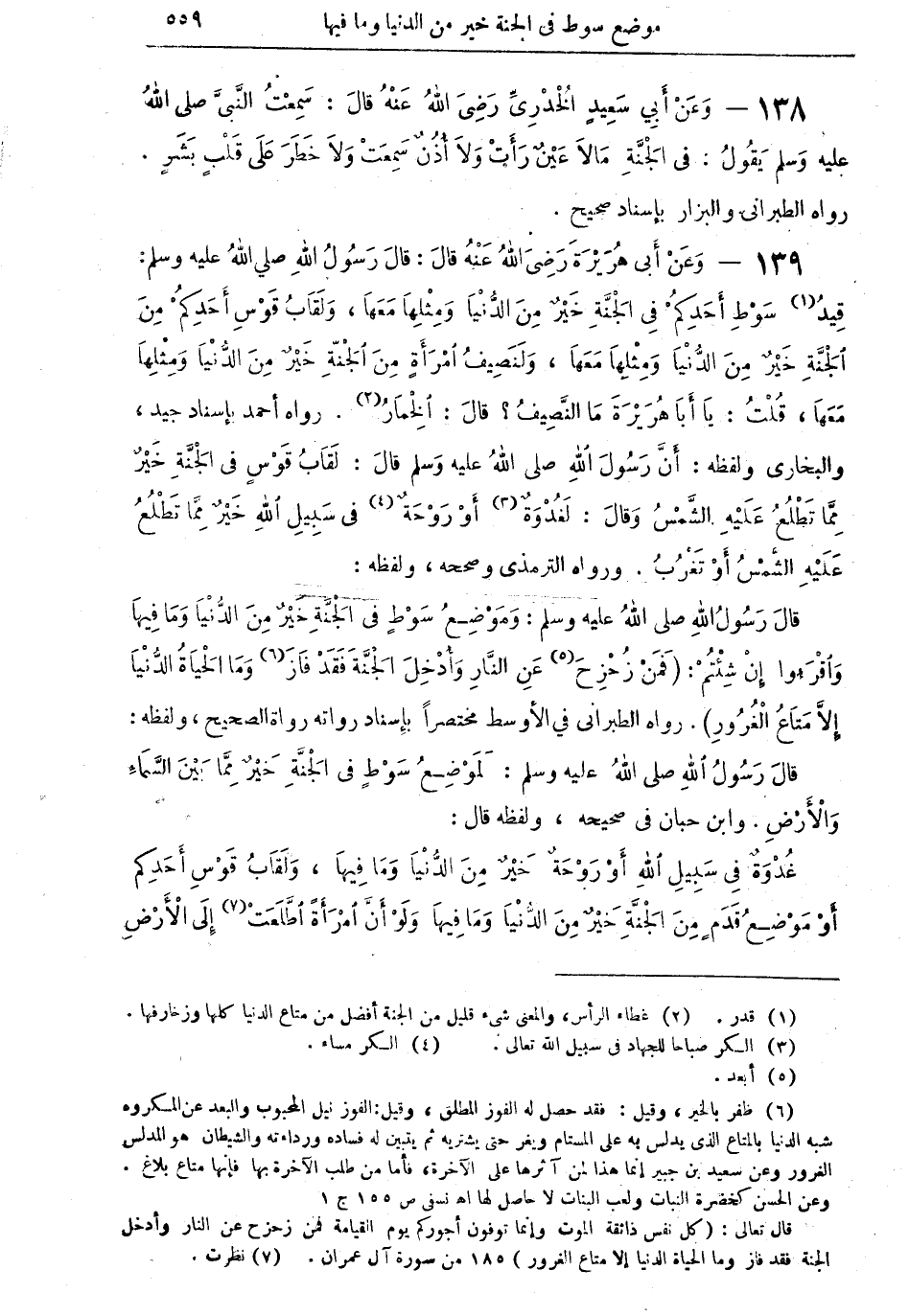 139 - وَعَنْ أَبِي هُرَيْرَةَ رَضِيَ اللهُ عَنْهُ قالَ: قالَ رَسُولُ اللهِ صلى اللهُ عليه وسلم: قِيدُ (¬1) سَوْطِ أَحَدِكُمْ في الْجَنَّةِ خَيْرٌ مِنَ الدُّنْيَا وَمِثْلِهَا مَعَهَا، وَلَقَابُ قَوْسِ أَحَدِكُمْ مِنَ الْجَنَّةِ خَيْرٌ مِنَ الدُّنْيَا وَمِثْلِهَا مَعَهَا، وَلَنَصِيفُ امْرَأَةٍ مِنَ الْجَنَّةِ خَيْرٌ مِنَ الدُّنْيَا وَمِثْلِهَا مَعَهَا، قُلْتُ: يَا أَبَا هُرَيْرَةَ مَا النَّصِيفُ؟ قالَ: الْخِمَارُ (¬2). رواه أحمد بإسناد جيد، والبخاري ولفظه: أَنَّ رَسُولَ اللهِ صلى اللهُ عليه وسلم قالَ: لَقَابُ قَوْسٍ في الْجَنَّةِ خَيْرٌ مِمَّا تَطْلُعُ عَلَيْهِ الشَّمْسُ وقالَ: لَغُدْوَةٌ (¬3) أَوْ رَوْحَةٌ (¬4) في سَبِيلِ اللهِ خَيْرٌ مِمَّا تَطْلُعُ عَلَيْهِ الشَّمْسُ أَوْ تَغْرُبُ. ورواه الترمذي وصححه، ولفظه: