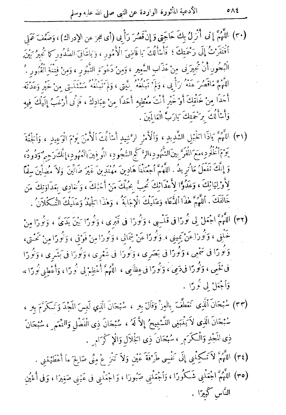 (30) اللَّهُمَّ إِنِّي أُنْزِلُ بِكَ حَاجَتِي وَإِنْ قَصُرَ رَأْيِي (أي عجز عن الإدراك)، وَضَعُفَ عَمَلِي افْتَقَرْتُ إِلى رَحْمَتِكَ؛ فَأَسْأَلُكَ يَا قَاضِيَ الأُمُورِ، وَيَا شَافِيَ الصُّدُورِ كما تُجِيرُ بَيْنَ الْبُحُورِ أَنْ تُجِيرَنِي مِنْ عَذَابِ السَّعِيرِ، وَمِنْ دَعْوَةِ الثُّبُورِ، وَمِنْ فِتْنَةِ الْقُبُورِ. اللَّهُمَّ مَا قَصُرَ عَنْهُ رَأْيِي، وَلَمْ تَبْلُغْهُ نِيَّتِي، وَلَمْ تَبْلُغُهُ مَسْأَلَتِي مِنْ خَيْرٍ وَعَدْتَهُ أَحَداً مِنْ خَلْقِكَ أَوْ خَيْرٍ أَنْتَ مُعْطِيهِ أَحَداً مِنْ عِبَادِكَ، فَإِنّي أَرْغَبُ إِلَيْكَ فِيهِ وأَسْأَلُكَ بِرَحْمَتِكَ يَا رَبَّ الْعَالَمِينَ.